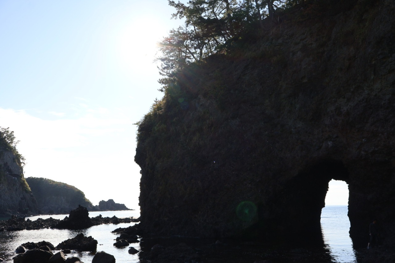 日本海の荒波に削られてできた、高さ15mの迫力ある洞門です。
