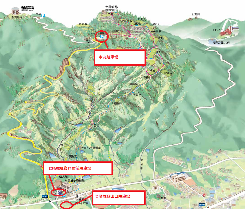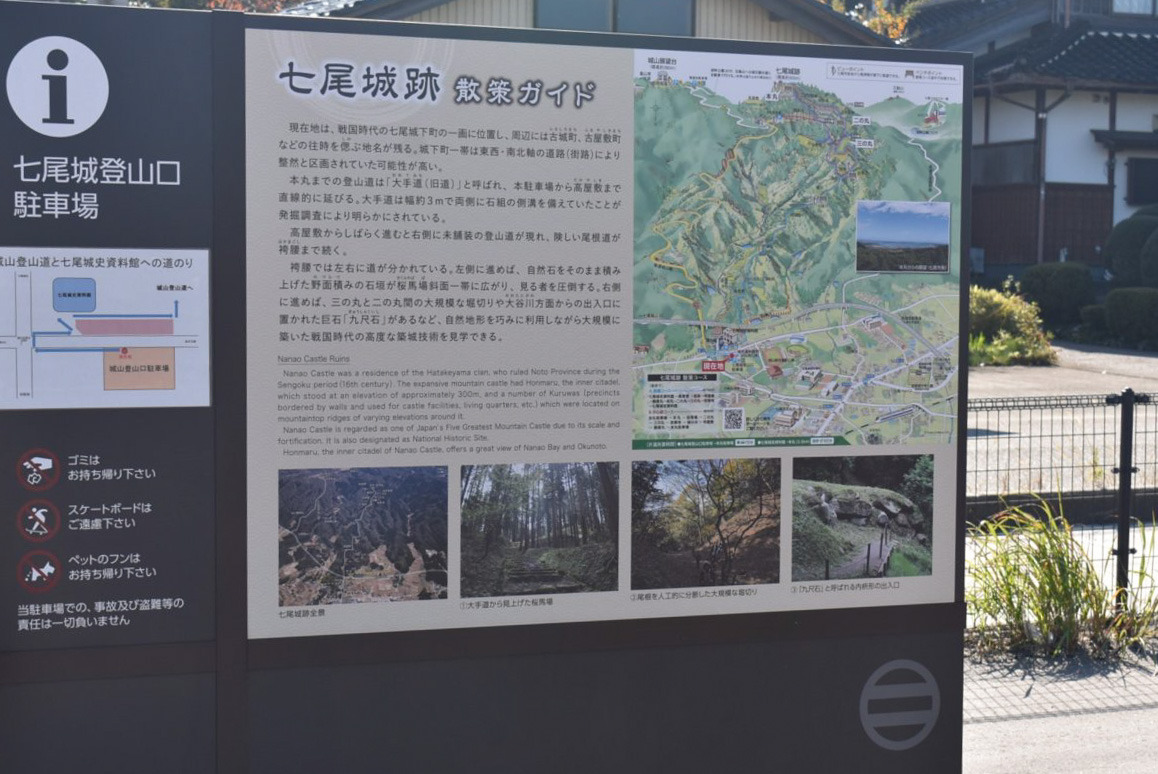 麓から散策したいという方は、七尾城登山口駐車場か七尾城史資料館前の駐車場に停めて散策しましょう。