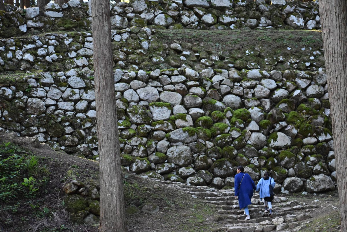 七尾城跡に残っている石垣は、自然石を加工せずに積み上げた野面積みで築かれたものです。石材の多くは山麓にかけての谷筋の沢から運ばれたもので、規模の大きい石垣は本丸から二の丸の斜面で見ることができます。