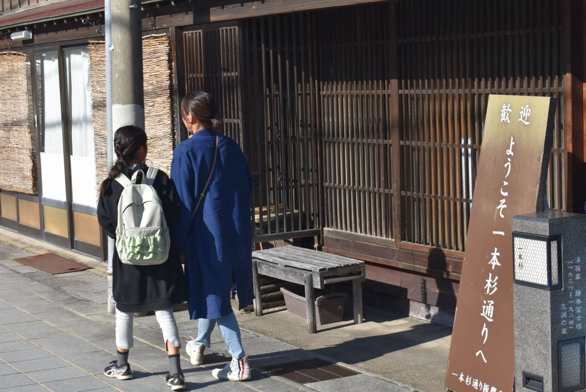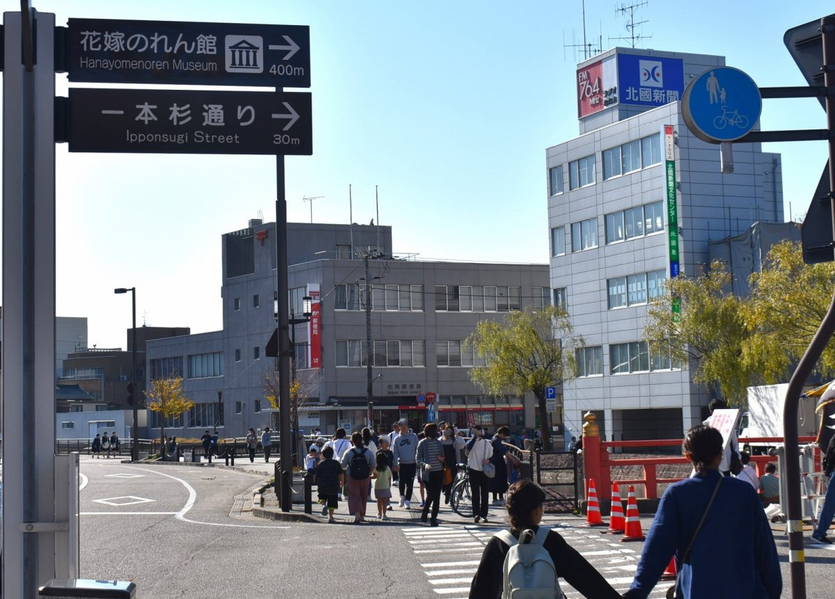 七尾駅前を流れる御祓川沿いに5分程度歩くと一本杉通りにつきます。赤い欄干の仙対橋が入り口となり、約50店舗ほどのお店が建ち並ぶ600年以上の歴史を持つ街道です。