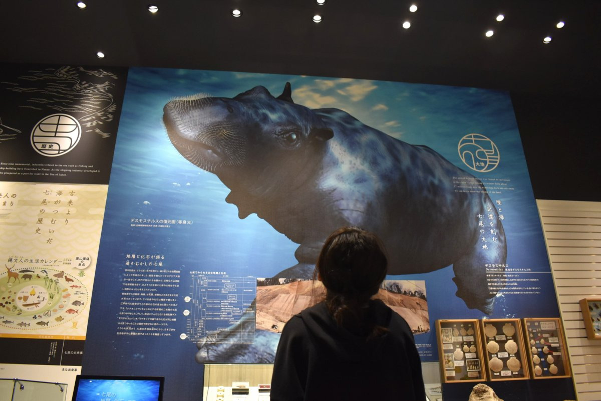 七尾で発掘された大型哺乳類デスモスチルスの等身大パネルや歯の化石が展示されており、いろいろな視点で七尾の大地の成り立ちを知ることができます。