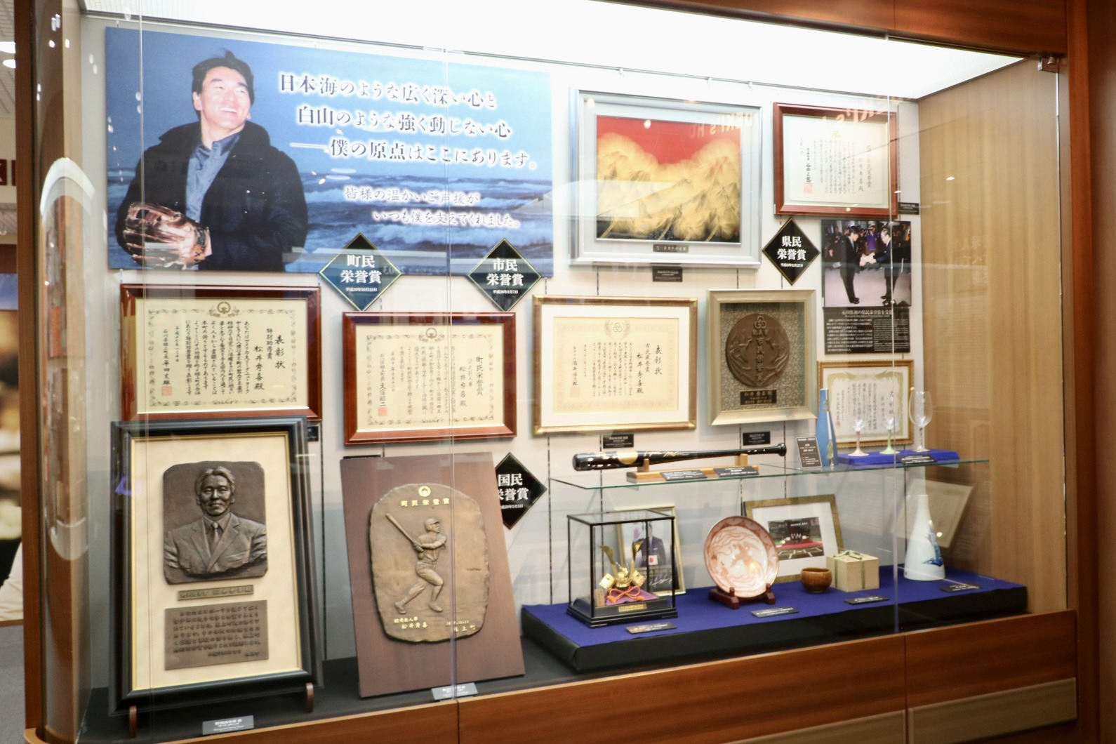 展示室へ入ると、幼少期の松井氏の写真や作品、中学高校時代の野球道具などが飾られており、少年時代からの功績も知ることができます。