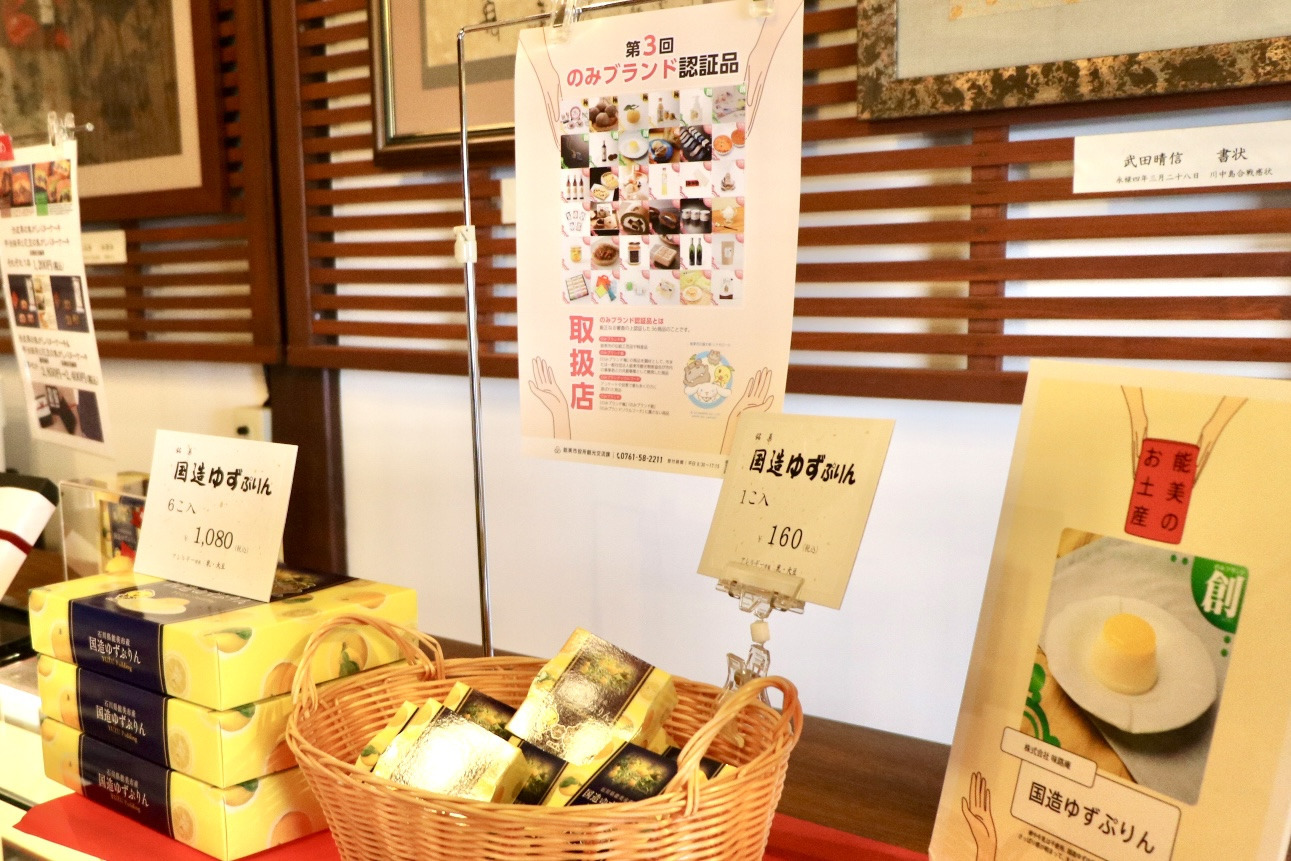 こちらのお店は、きんつばなどのお菓子を製造販売されていて、『国造ゆずぷりん』は「のみブランド創」として認証されています!