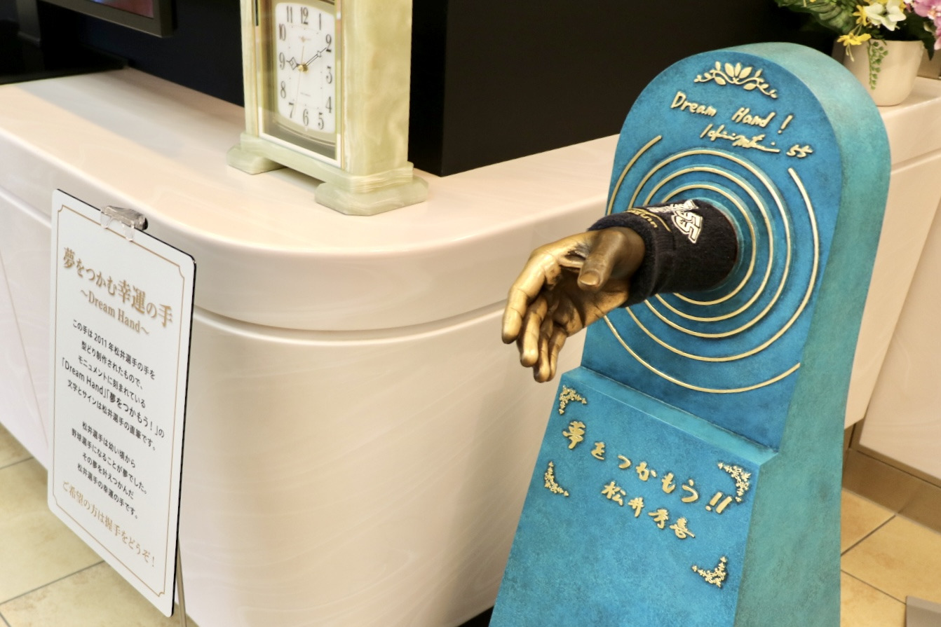 まず、入館してすぐに、広いエントランスがあり、松井氏の人形と並んで記念撮影をしたり、松井氏の右手を型取られた大きな手と握手することができます。