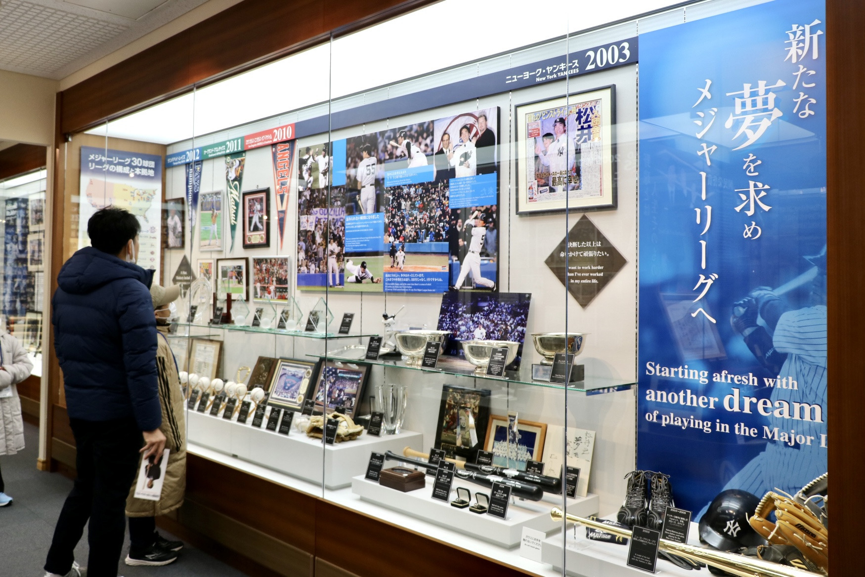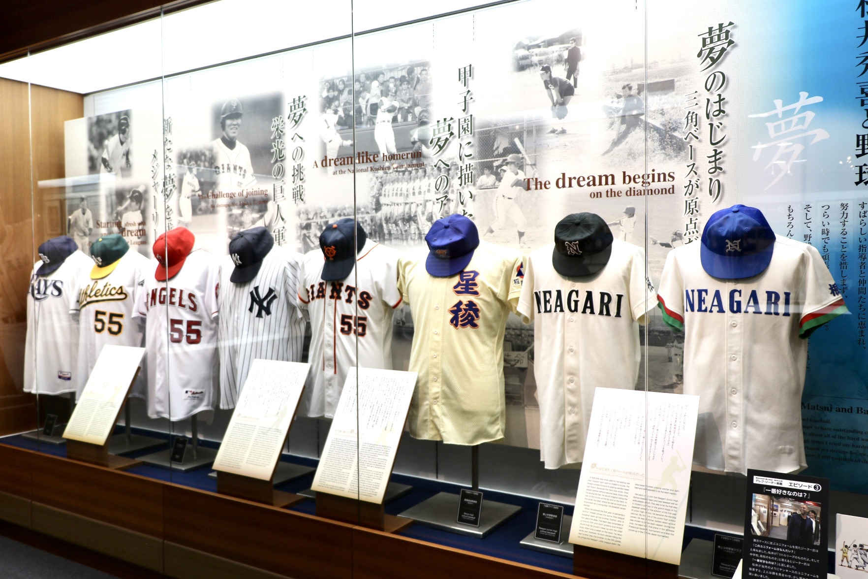 そして、少年野球時代からメジャーリーガー時代のユニフォーム、数多く獲得されたトロフィーや盾などもたくさん並べて展示されており、松井氏が夢を追いかけ続けた歴史と功績を実感できます。松井氏の名言も色々なところに展示されていて、野球への熱い思いやお人柄が伝わってきました。