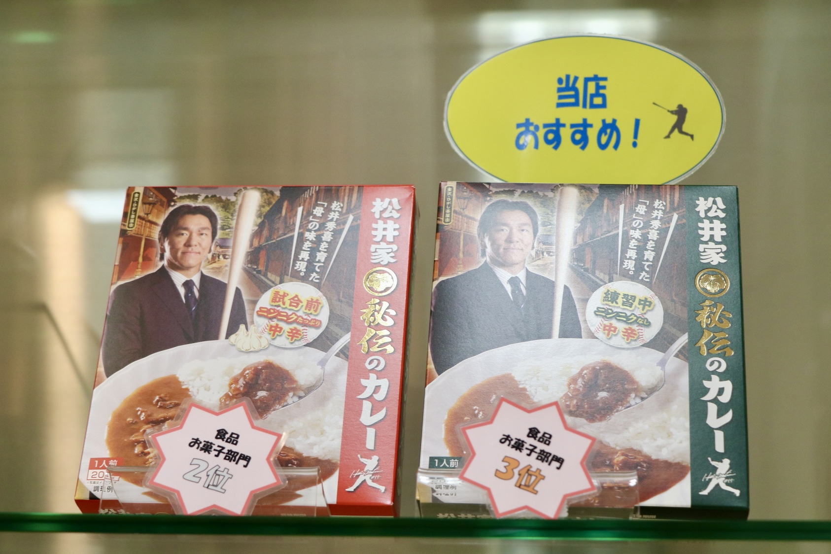 松井氏の母の味であるカレーは、試合前・練習中の2種類がレトルトで再現され販売されていました。