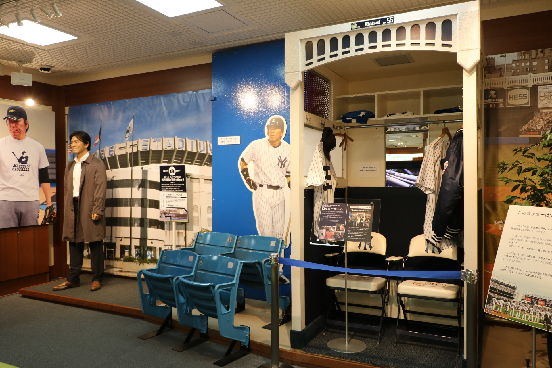 また、旧ヤンキースタジアムの外野ラバーフェンスや観客席ベンチ、一塁ベース、実際に使用されていた松井氏のロッカーを見ることもできます。