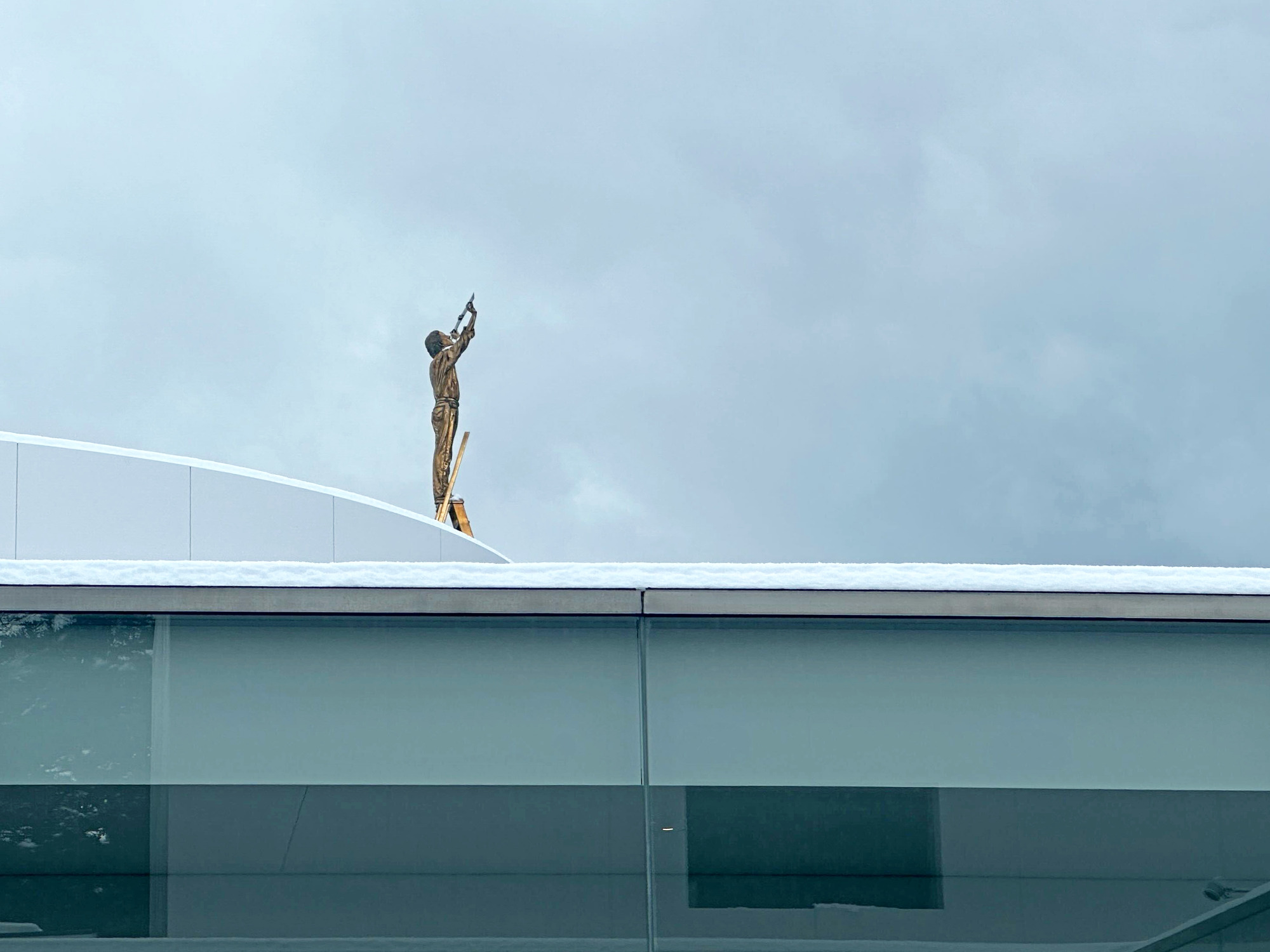 この日は雨ではなく雪だったので、外の芝生は真っ白に雪化粧。内装壁面の「白」× 雪の「白」で、モノクロの世界がニュートラルな雰囲気。うむむ・・・なんだかおしゃれ~~♩ 偶然モノトーンコーデだったので、ポートレートもいい感じに撮れました◎