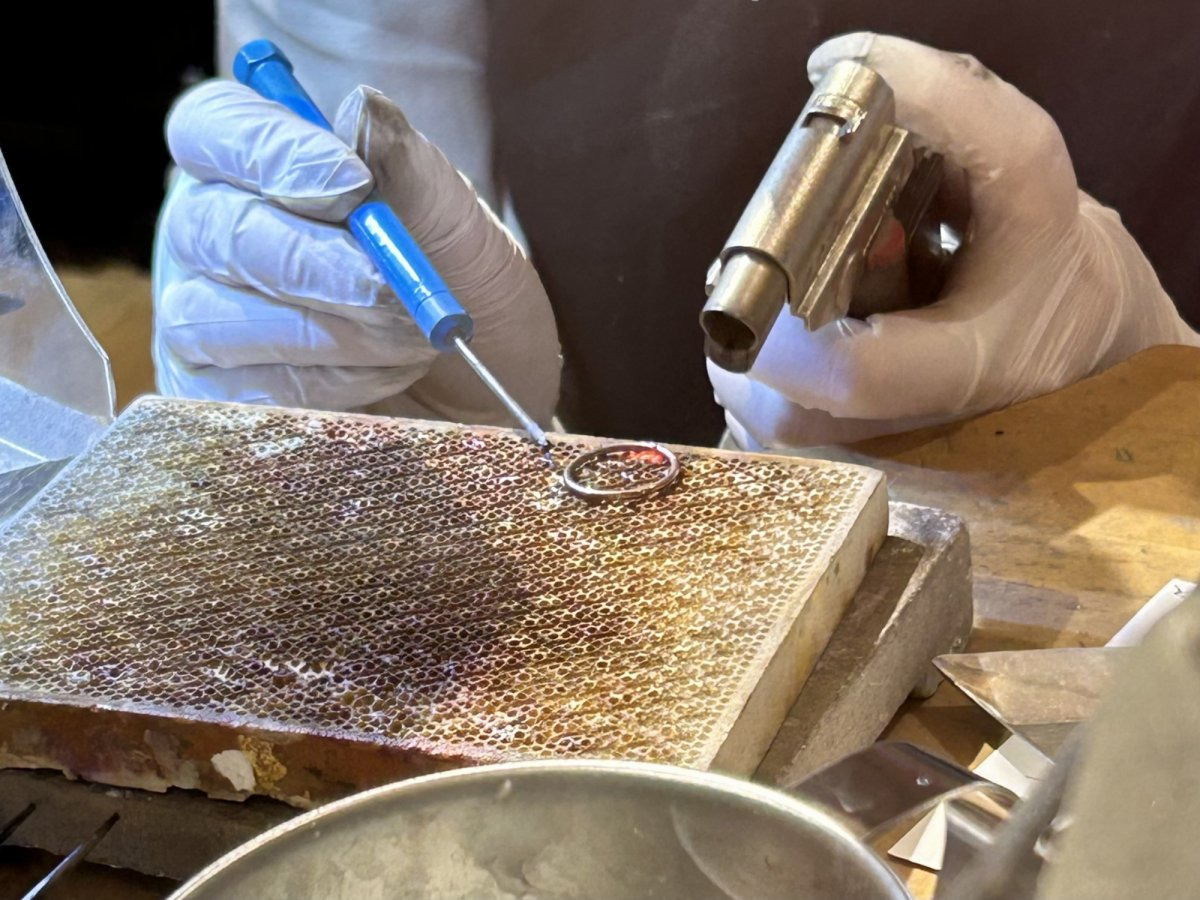 全てのオーダーが決まるとお店の方がベースの指輪を作りはじめてくれます。はじめは小さいサイズの指輪から、金属の叩くと伸びる性質を利用して自分の指の大きさに合わせていくそうです!