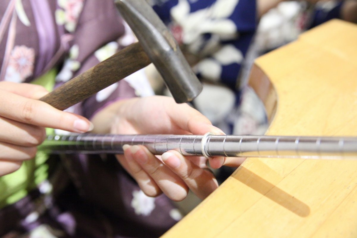 ベースの指輪が完成したら金槌で指輪を打っていきます。今回は指輪の重ね付けをするために指輪を二つ製作しました。一つをポコポコ、もう一つをザラザラの模様にしました!ポコポコは少ない回数で模様をつけていくと綺麗に仕上がるそうです。逆にザラザラはたくさん叩く方がいいそうです!(1人1つ以上のリングを製作希望の方は事前にお問い合わせが必要です。)