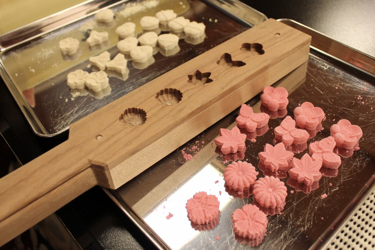 材料が完成したら木型に打ち粉をし、材料を山盛りに乗せていきます。木型は鈴やこま、小判、俵などの縁起物、貝、草花などの全4種類あります。山盛りにした材料を指で力を込めて型の中に詰めていきます。この時に力強く押し込むと型から出した時に綺麗な形に仕上がります!