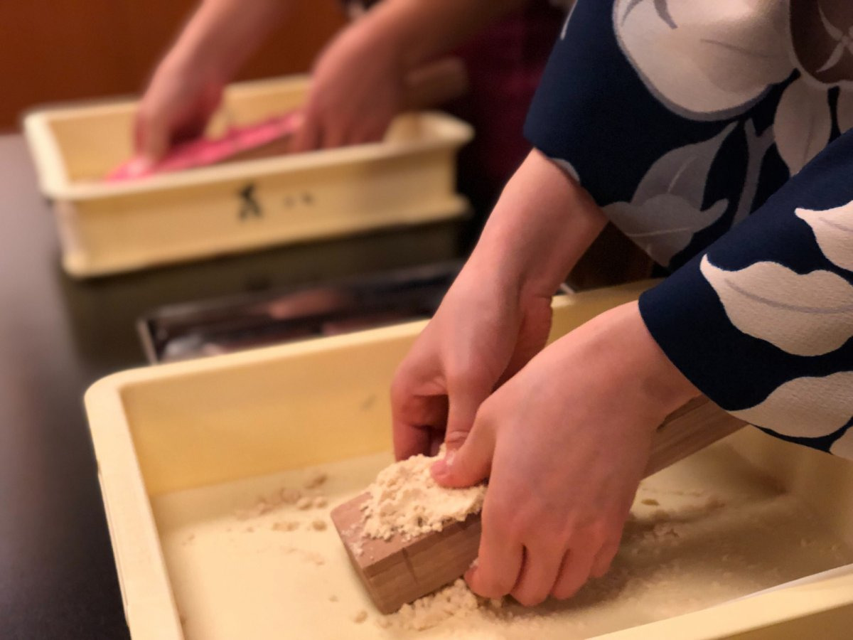 手を洗ってエプロンを付けたら、まずは木の板を使って材料をよく揉んでいきます。木の板を両手で持って上から体重をかけるように押していき、持ち上げた時に材料が木の板に付いてくるまで揉んでいきます。材料をしっかり揉むことで水分が回ってさらさらとした粉からふわふわとした手触りに変化するそうです!