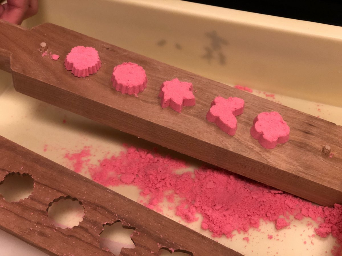 材料を型にはめたらはみ出した材料をヘラで落とし、木型の上部を外して軽く叩くと型にはめた落雁が落ちてきます。これで完成です!あとはこの作業を材料がなくなるまで繰り返し行っていきます。合計で12〜15個の落雁を作ることができます。