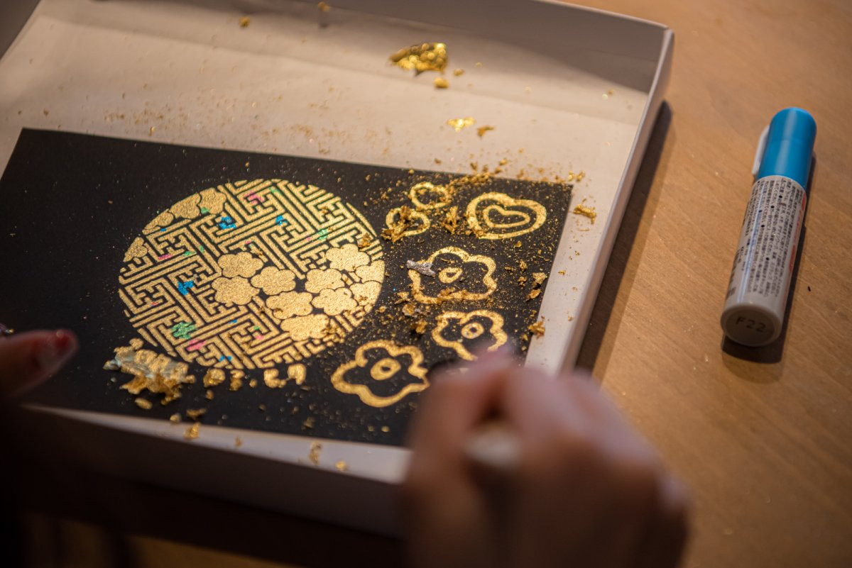 ここ今井金箔さんは明治三十一年に創業し、百年以上金箔の伝統を守ってきました。本店ではお子様でも簡単にできるハガキから日常使いしやすいタンブラーやポーチまで様々な金箔貼り体験をすることができます。