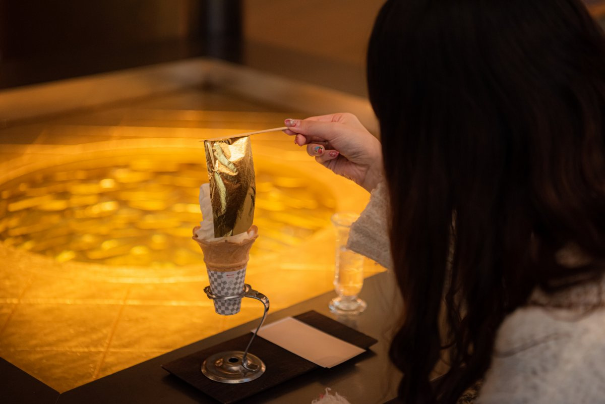そしてなんとここ本店では、あの名物金箔ソフトが自分で作れちゃうんです!1万分の1ミリといわれる金箔を貼る作業は鼻息一つにも細心の注意を払いながら一発勝負のドキドキ感が味わえます!