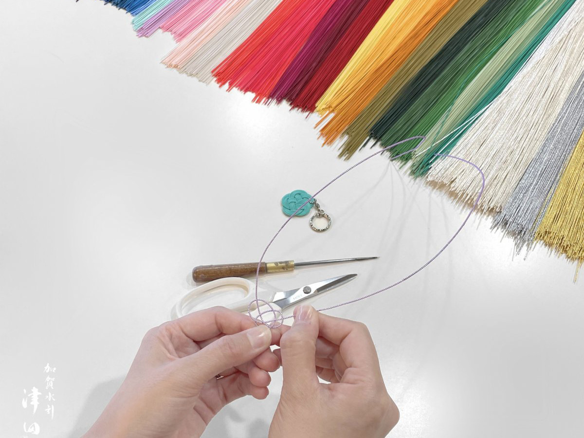 一番人気は水引のチャーム!水引の梅結びを利用した可愛いらしい花柄のチャームです。輪っかに水引を通す作業を繰り返してお花の形を作っていきます。少し分かりづらい工程ですが、下→上→下→上の順番で覚えておくと楽にできます!