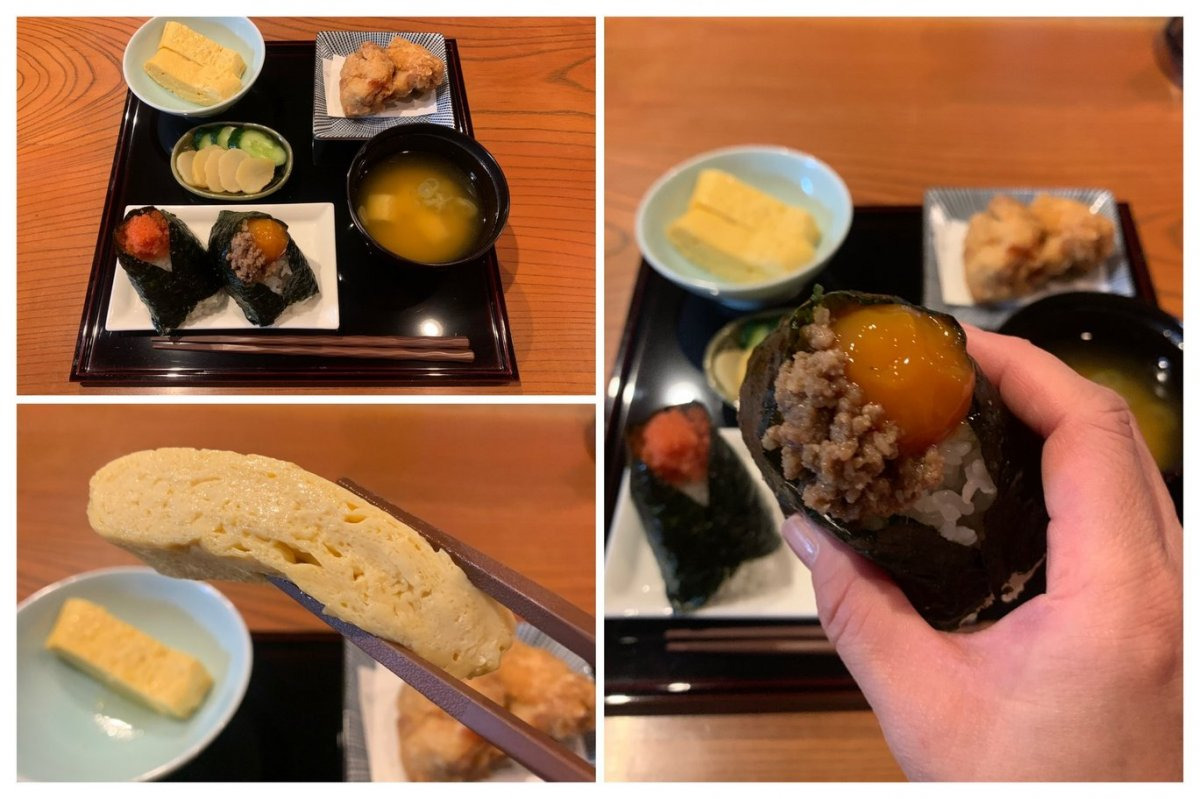 禄セットは鶏唐揚げ2個とだし巻き玉子、漬物、味噌汁がついてます。これにおにぎりの値段がプラスされます。私が注文したおむすびは人気だという「明太子」と「肉そぼろ卵黄づけ」の2種。