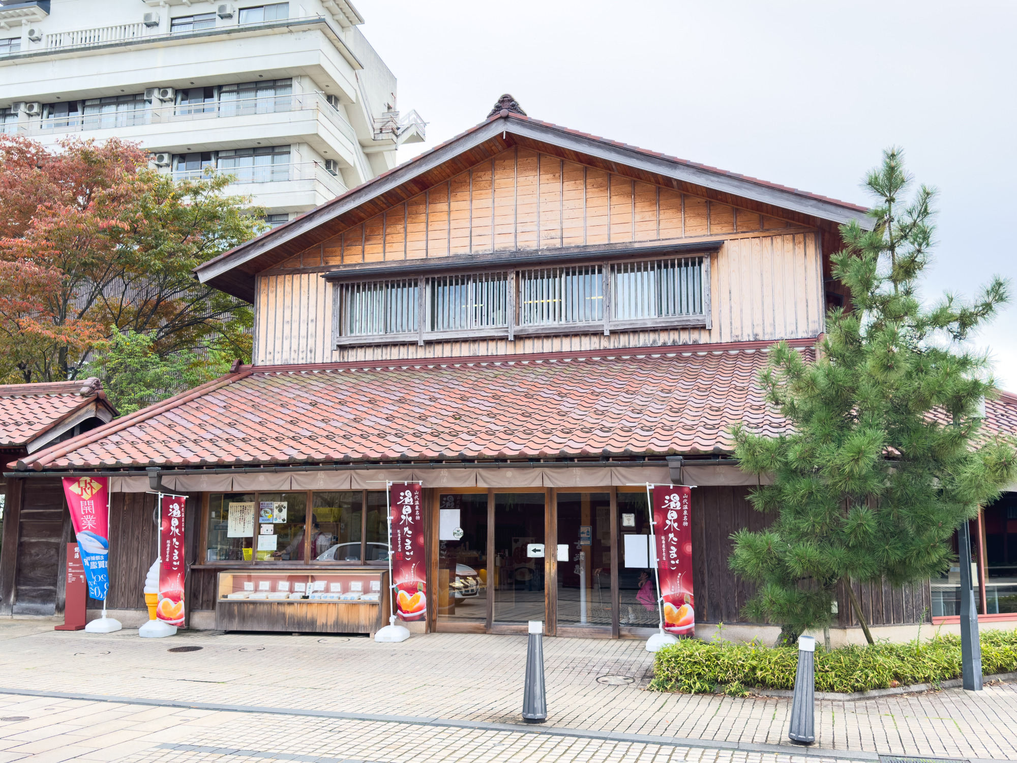 老舗旅館であった魯山人ゆかりの旧吉野屋旅館の門をくぐると、広々とした休憩コーナーがあり、名物の温玉ソフトクリームを始め温泉たまご等のお土産も販売もしています♪