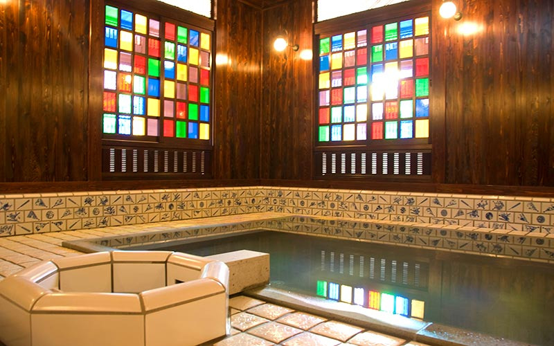 古総湯の大きな特徴は、明治時代に流行したステンドグラスが湯船に鮮やかな光をおとし、床や壁の九谷焼のタイルの絵柄までも当時のまま復元!