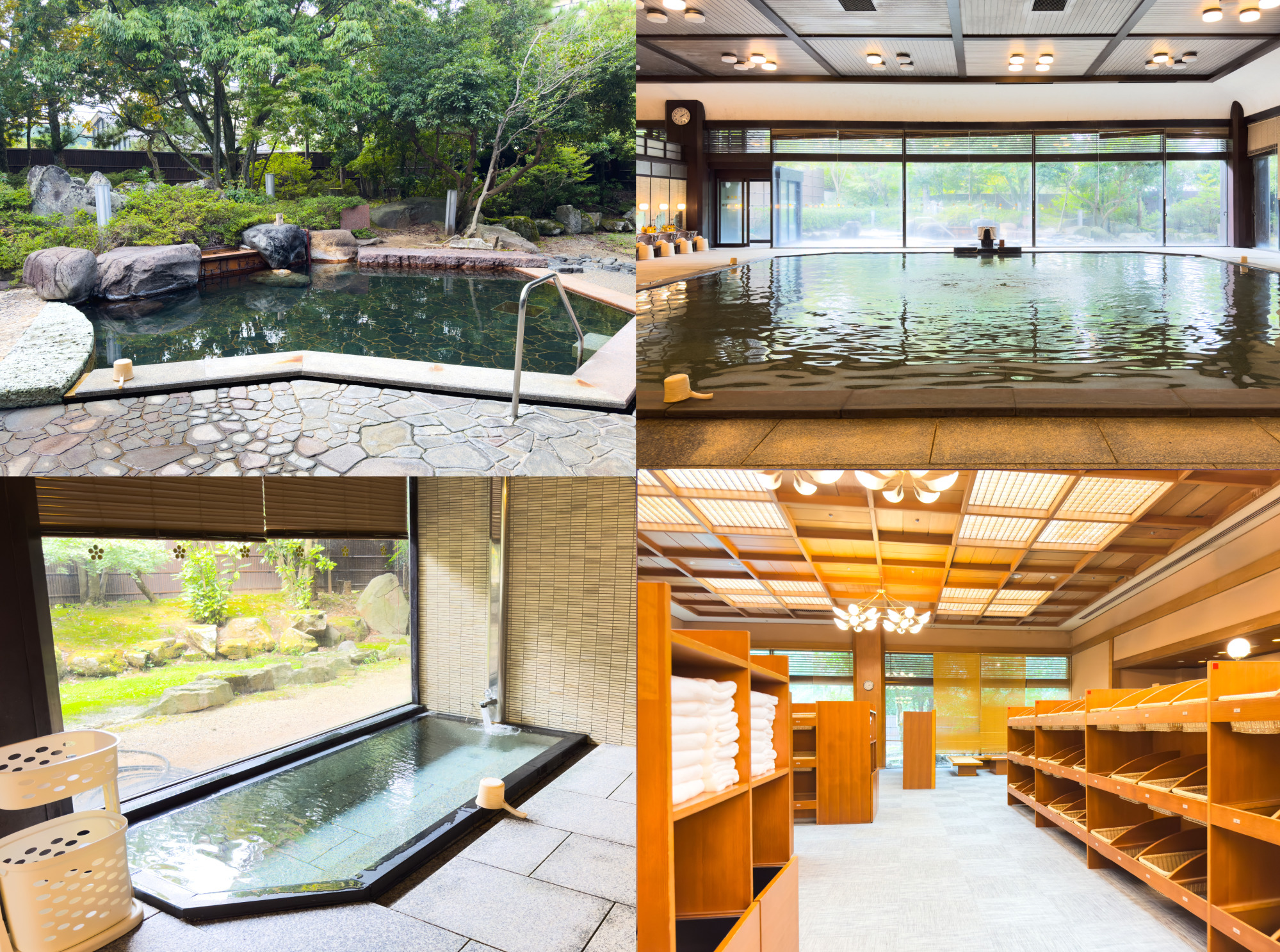 石庭庭園の風情に囲まれた解放感あふれる庭園露天風呂や気持ちのいい広々とした大浴場にサウナを完備!