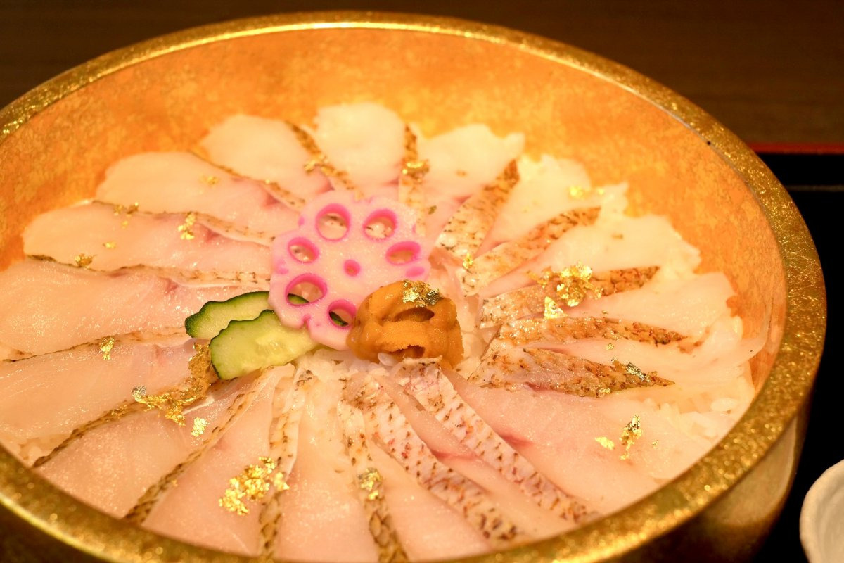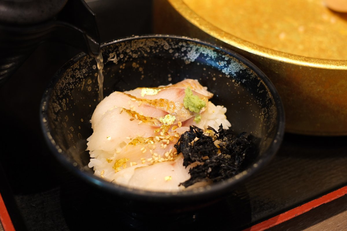 うなぎのひつまぶしと同様3杯に分けて、1杯目はのどぐろ丼として、2杯目はウニや薬味と一緒に、3杯目はお出汁をかけてお茶漬けに。最初の1口で、皮目を炙られたのどぐろの香ばしさと甘い脂の味が◎