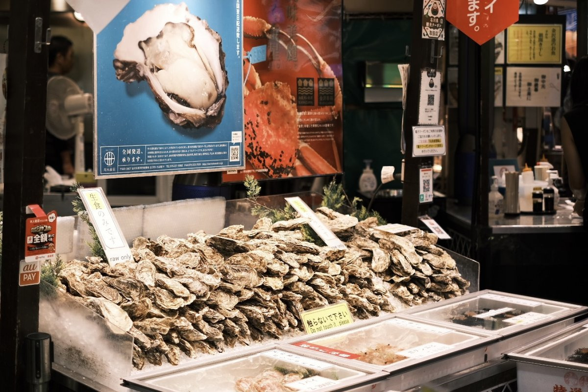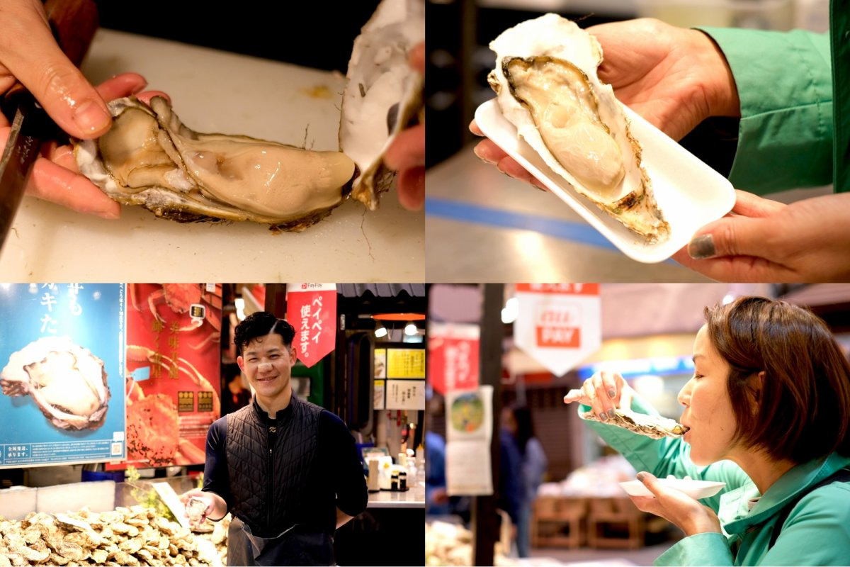鮮度抜群の殻付きの牡蠣を目の前で開けてくれて、その場で食べられるのは、なんとも市場らしい!牡蠣は季節によって美味しい産地のものを厳選しているとのことで、この日は濃厚でクリーミーな味わいが特徴の北海道産のものを頂きました。夏には能登の岩牡蠣もあります♫