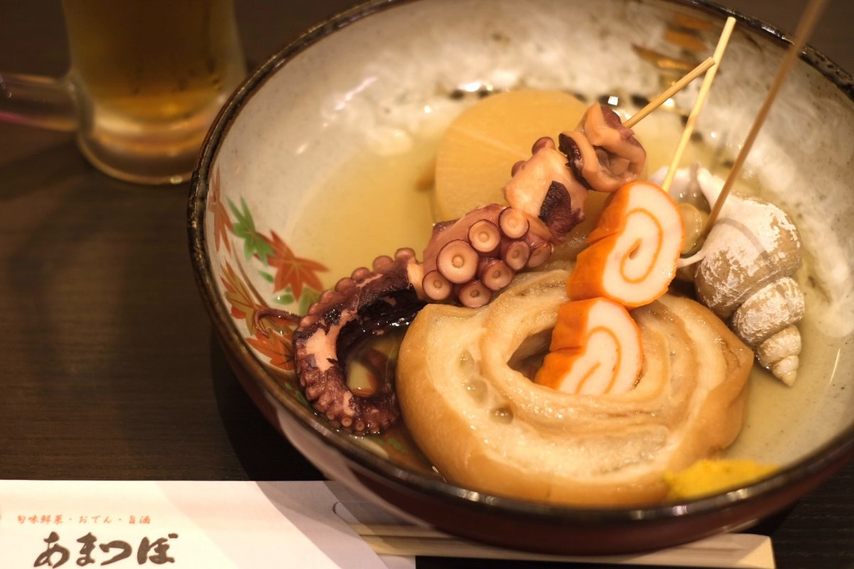 大根、車麩、バイ貝、たこ、赤巻の5点盛りです。お出汁がとにかく美味しいので、そのお出汁の中でじっくり煮込まれた食材は、どれもホロホロ柔らかく、とにかく美味!