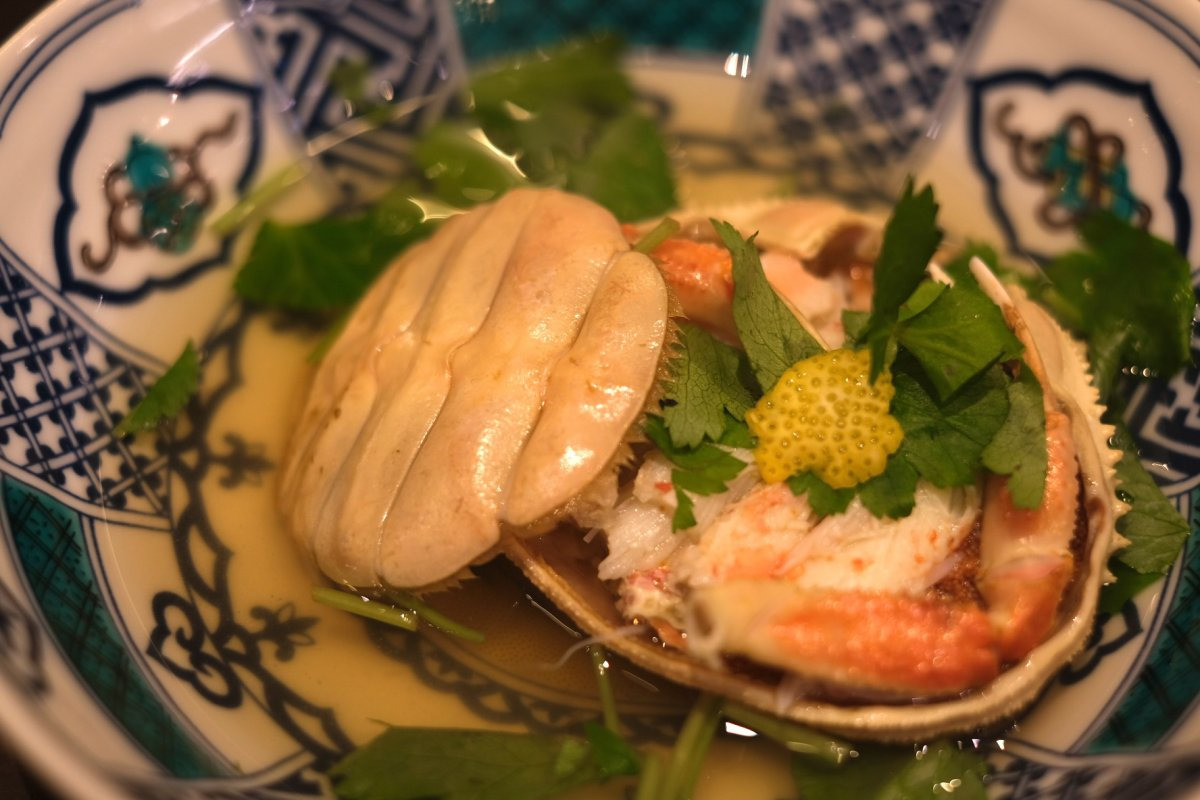 また、ちょうどズワイガニ漁解禁直後だったので、香箱ガニのかに面おでん(2,780円)もいただきました。かに面は、おでん以外にもカニ酢での注文も可能です。