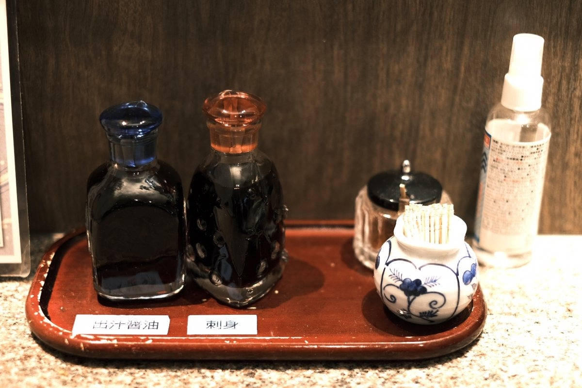 えにしさんには2種類のお醤油が置いてあります。赤い蓋の濃いめに仕上げた「刺身用醤油」と青い蓋のカツオ出汁で甘めに仕上げた「丼用醤油」です。