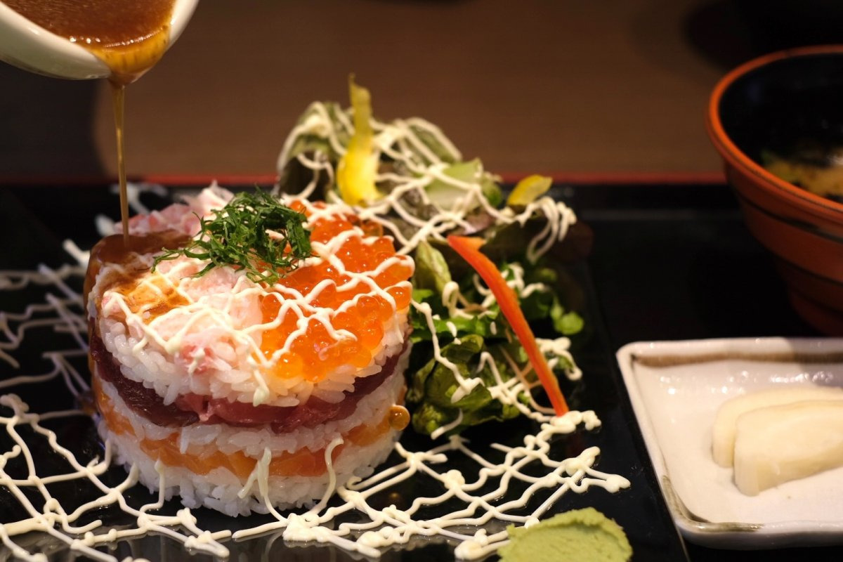 他の豪華な海鮮丼も魅力的だったのですが、ミルフィーユ寿司(1,680円)もおすすめとのことで頂きました。マグロ、サーモン、いくら、かにを使ったケーキのような変わり寿司です。