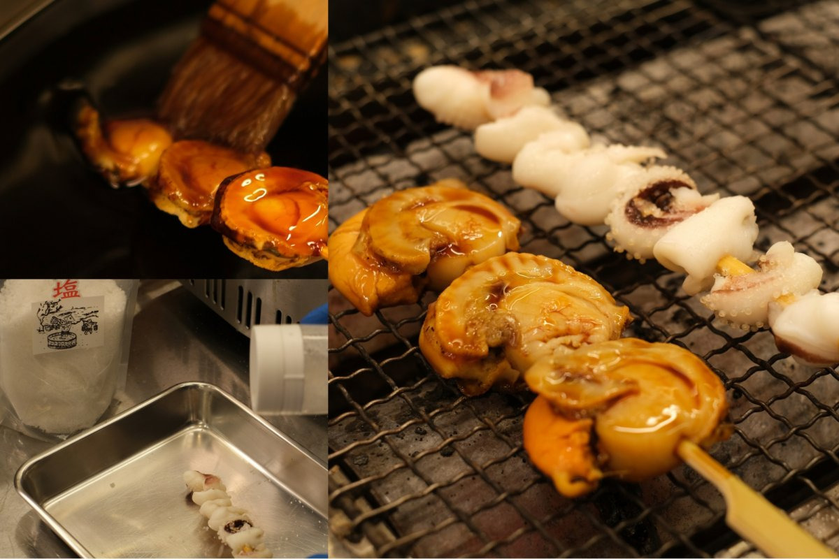 ホタテは甘塩っぱいタレとふわふわな身が絶品、イカ下足は、能登塩のしょっぱすぎないミネラルを感じる味付けにイカの食感がたまりません。