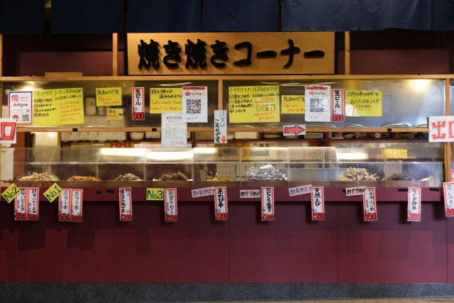 近江町市場の賑やかな鮮魚通りで、一際香ばしい香りをさせている「焼き焼きコーナー」。近江町市場で最大の売り場面積を誇る大口水産さんの一角にあります。