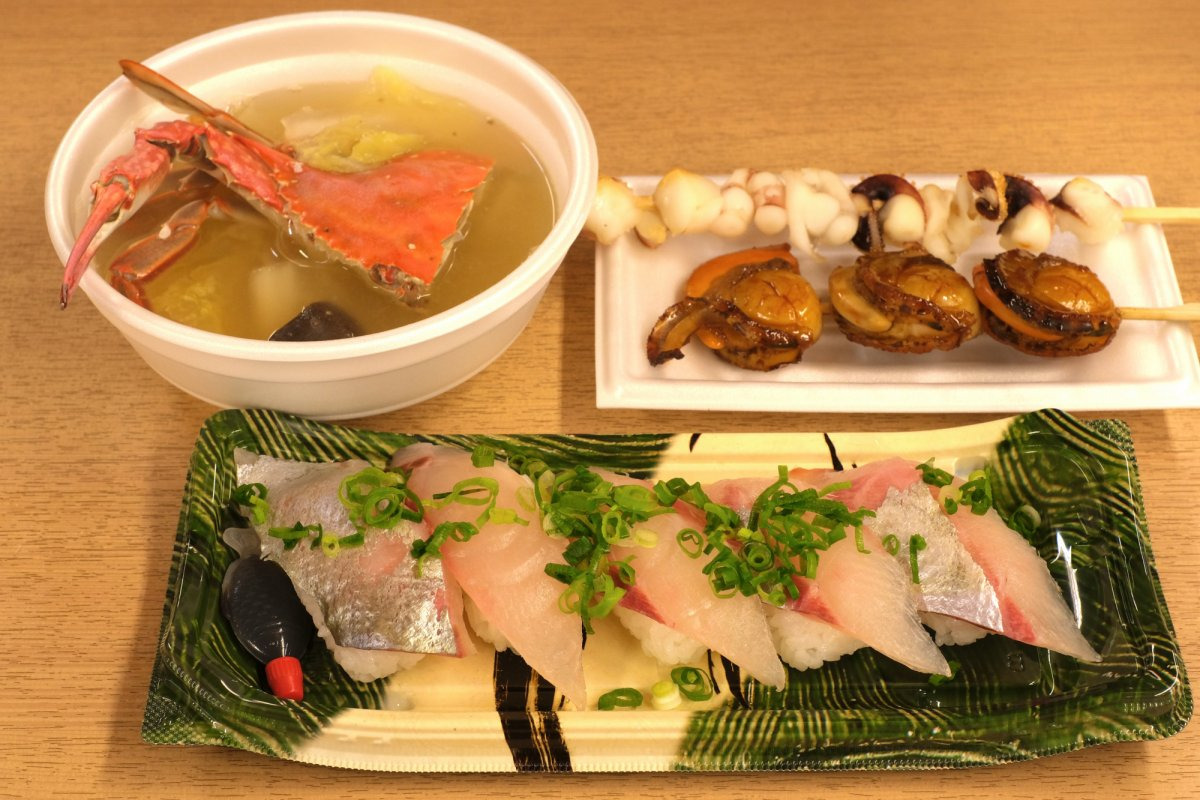ちなみに焼き焼きコーナーでは、生ビール(500円)もあります!その他のアルコール/ノンアルコールの飲み物や、寒い日にはカニ汁(500円)などの汁物があるのも嬉しいです。また、すぐ横ではお寿司も販売されています。