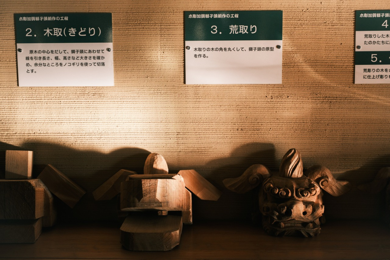 奥には獅子頭が完成するまでの経過が分かる作例などが置かれています。
