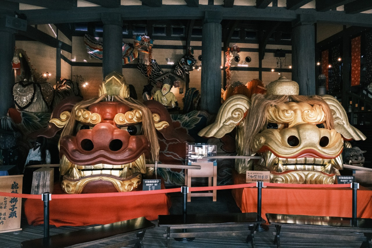 まず目を引くのは、この巨大な2頭の獅子頭。日本一大きいという夫婦獅子です。