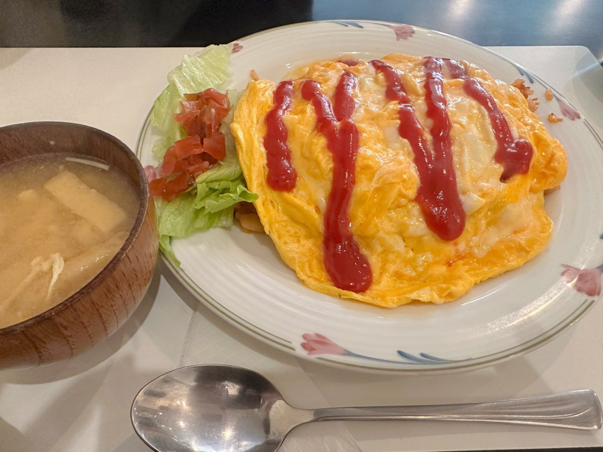 広げた手より一回り大きいくらいの特大サイズのオムライス、さらにお味噌汁付き。想像以上のボリュームにお腹がはち切れそうになりました!笑