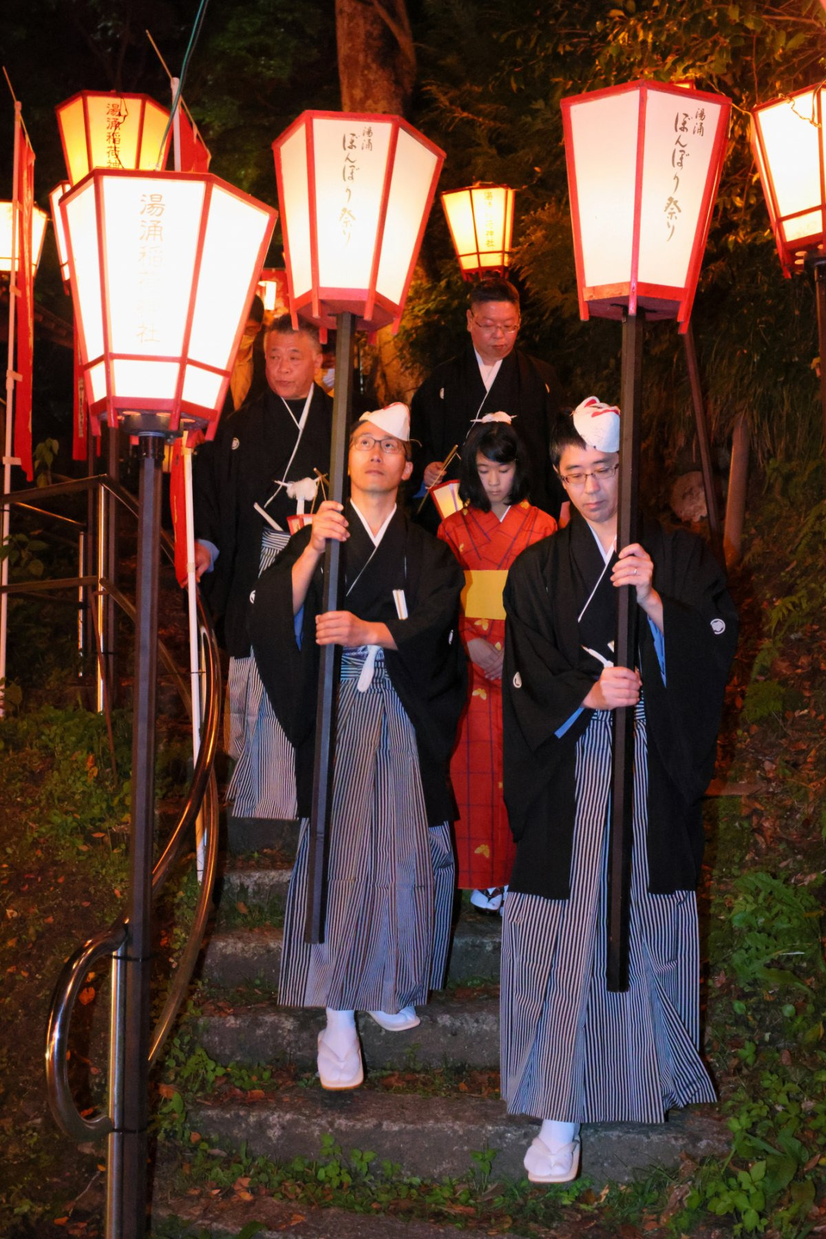 湯涌稲荷神社で神迎の儀が行われた後、キツネ面の男性に導かれた小さな女の子の神様が現れ、のぞみ札の入ったかごと共に玉泉湖へ向かいます。玉泉湖に到着すると神送の儀が執り行われ、のぞみ札のお焚き上げに。
