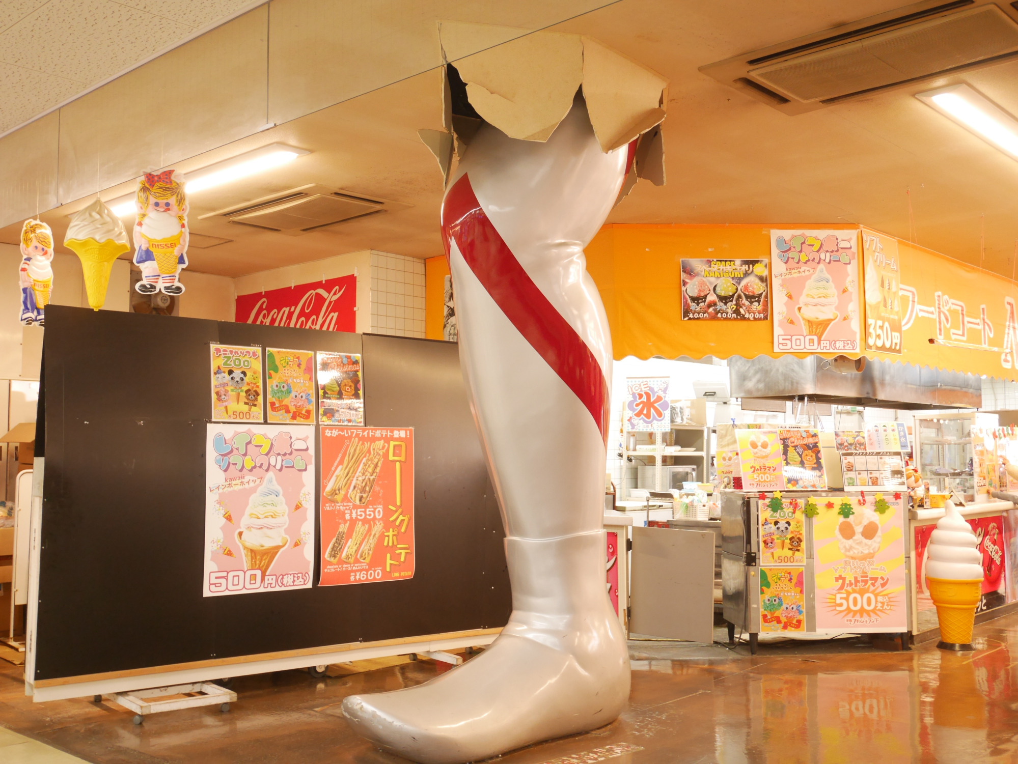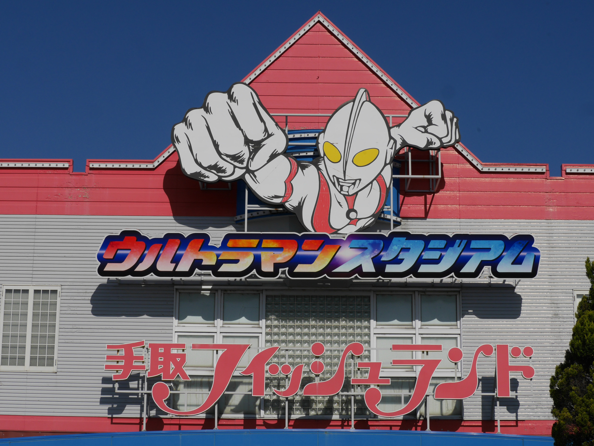 「手取フィッシュランド」の看板の上にある「ウルトラマンスタジアム」という看板。