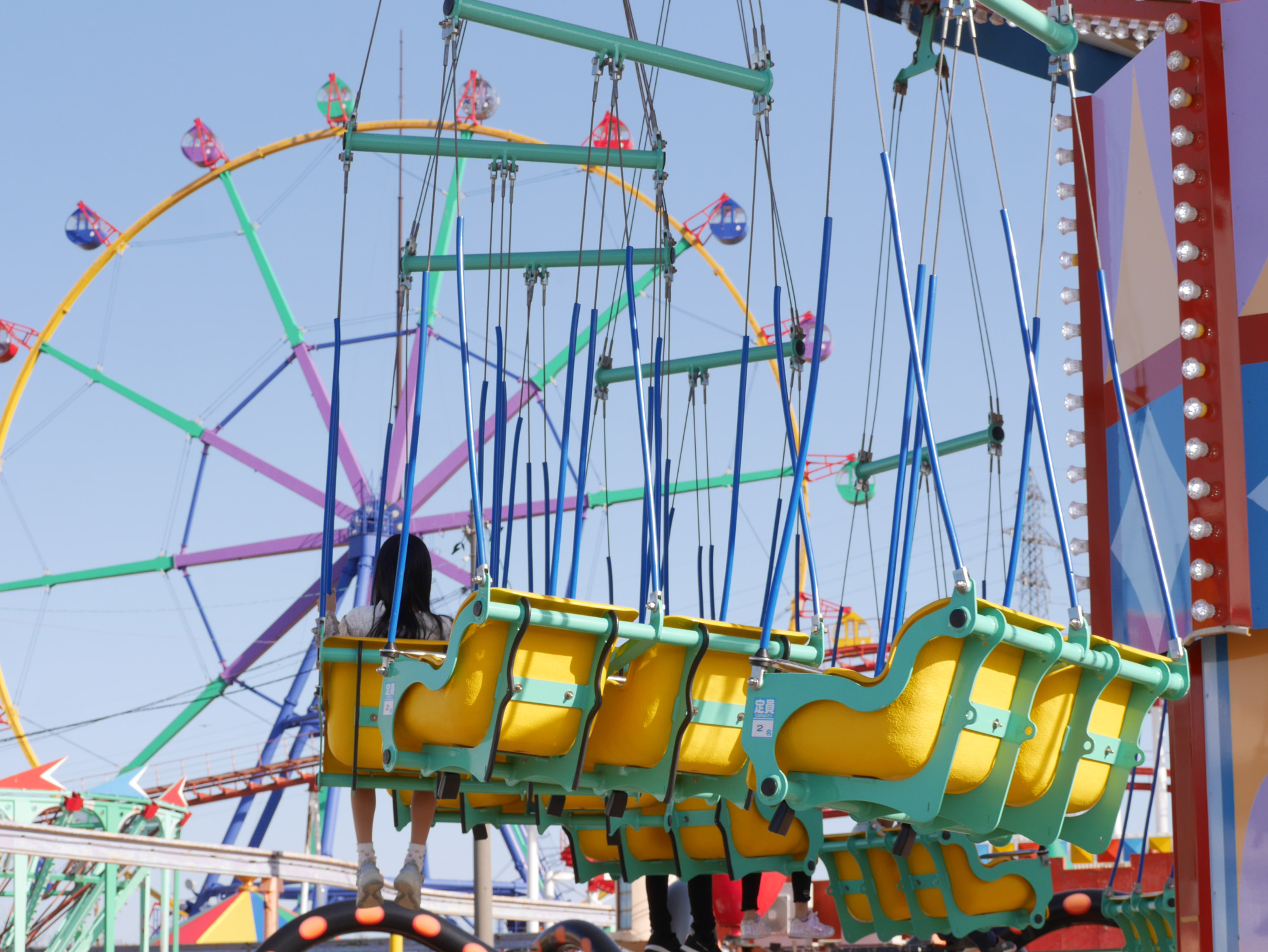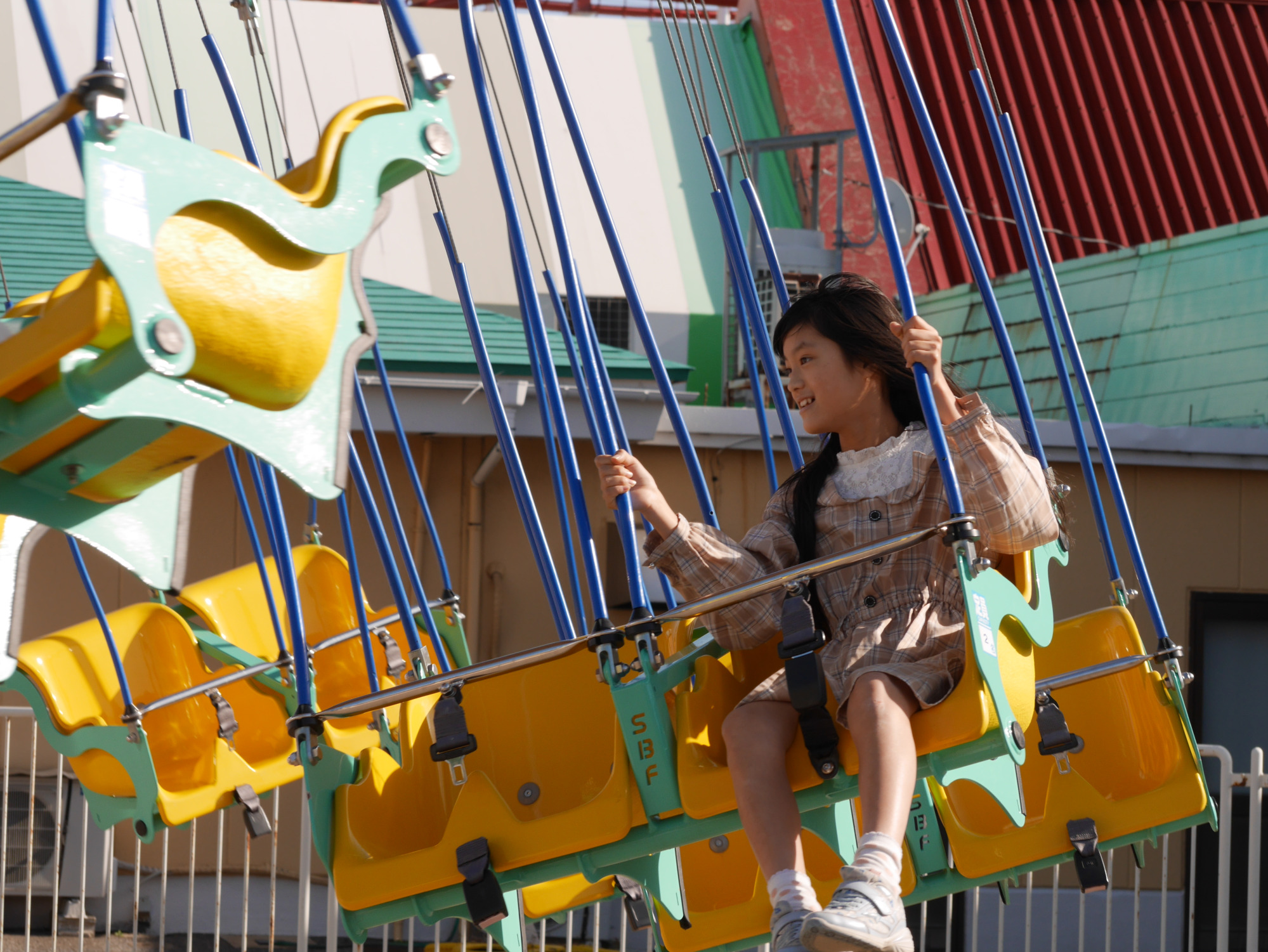身長110cmから楽しめる「ファミリースインガー」。天高く上っていくブランコのように空を舞います。