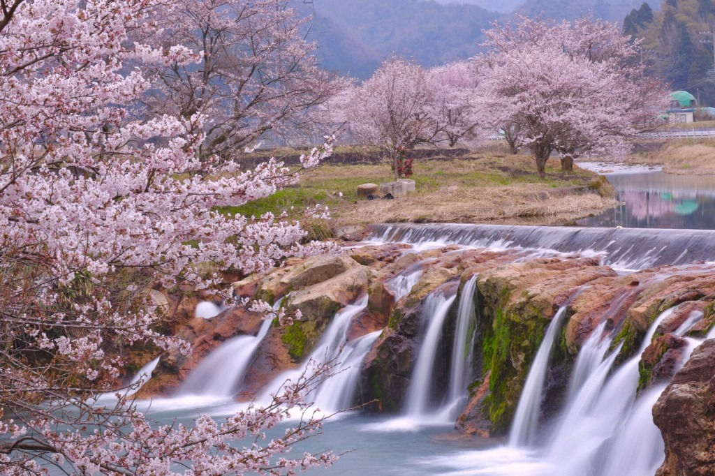 桜の時期には、山あいに咲くソメイヨシノが美しく、滝と桜のコントラストが絶景です!