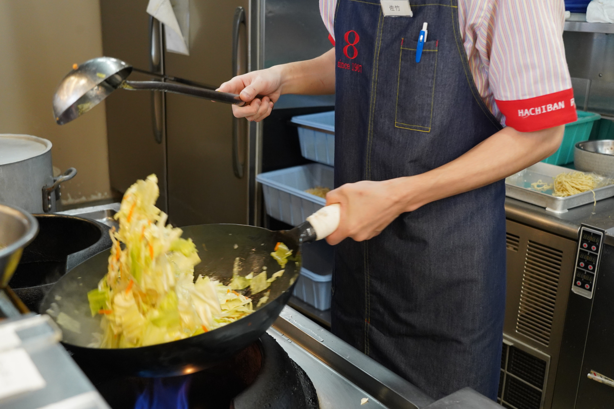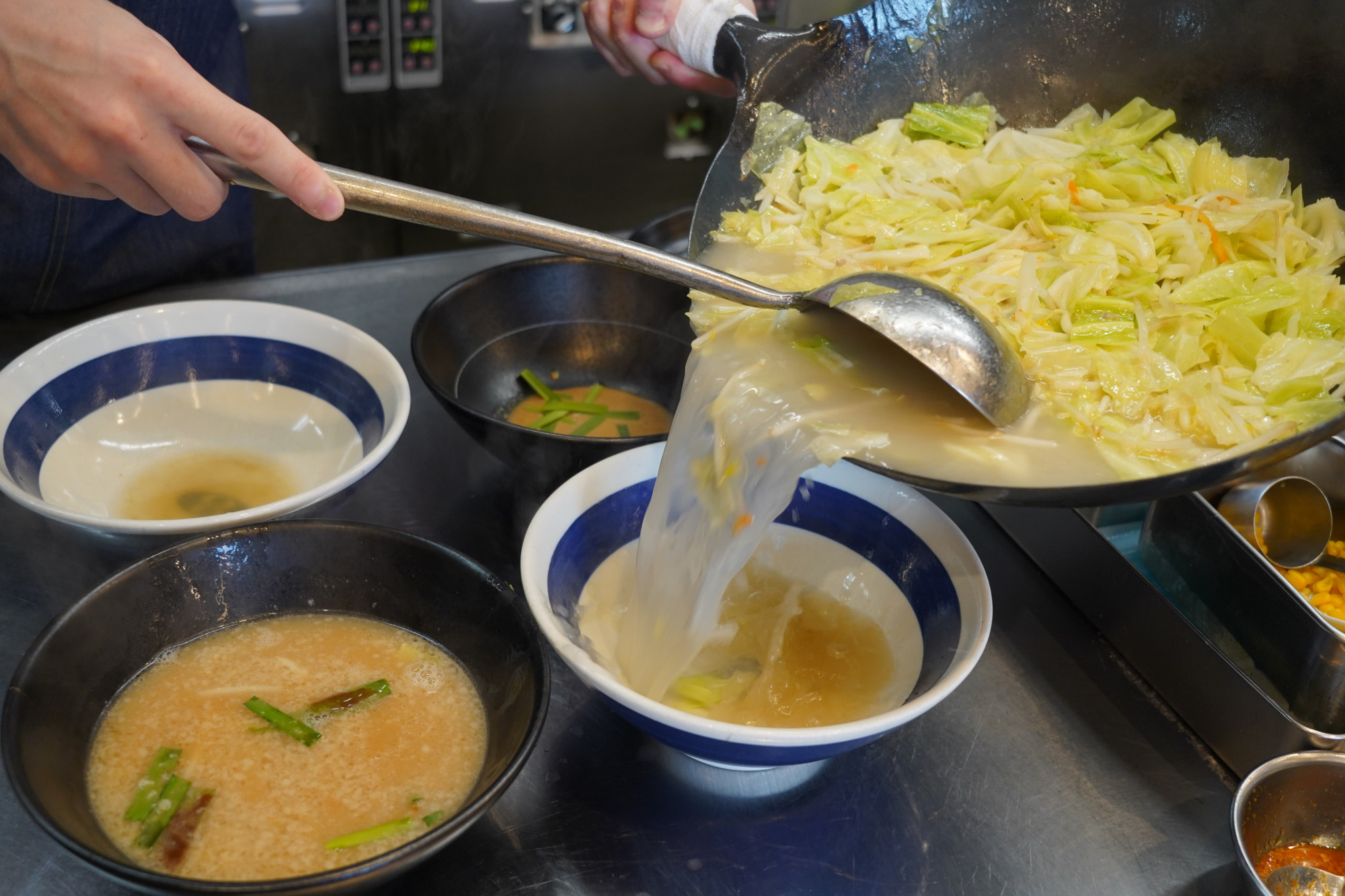 実はこの野菜らーめんを作れるのはフライパンマイスターという資格を持った熟練者だけ!キャベツの甘み、もやしのしゃきしゃき感がたまらない!