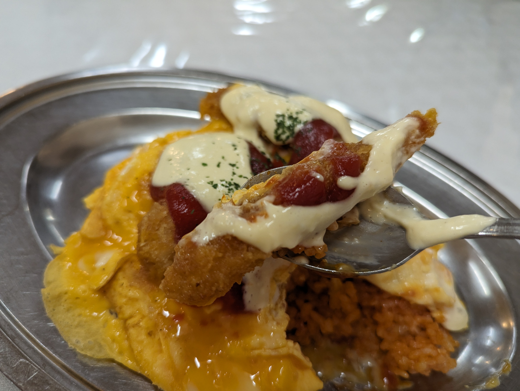 ケチャップライスを玉子で包み、上に白身魚のフライとエビフライが乗ったハントンライス。最初はまかないだったそうです。