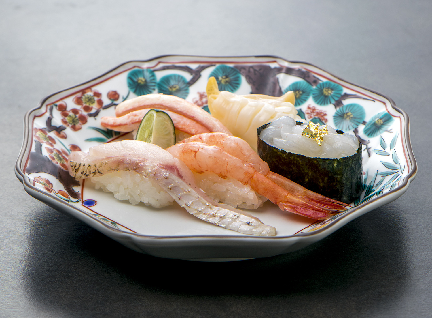 その日のおすすめネタの五貫盛りです。どのネタも旨味が強く、丁寧に握られた一貫一貫は納得のおいしさですよ。