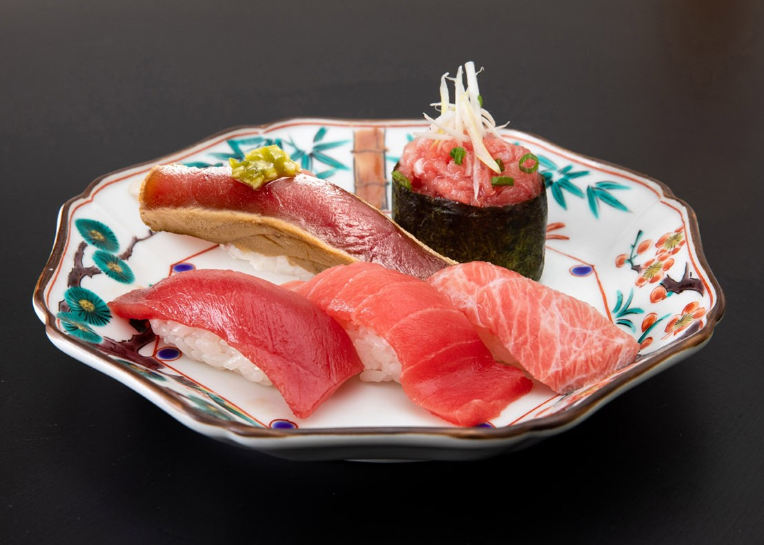 本まぐろ大とろ、中とろ、赤身、漬けまぐろ、上とろたたき軍艦の五貫盛りです。ねっとりとした上質なまぐろに思わずうっとり。