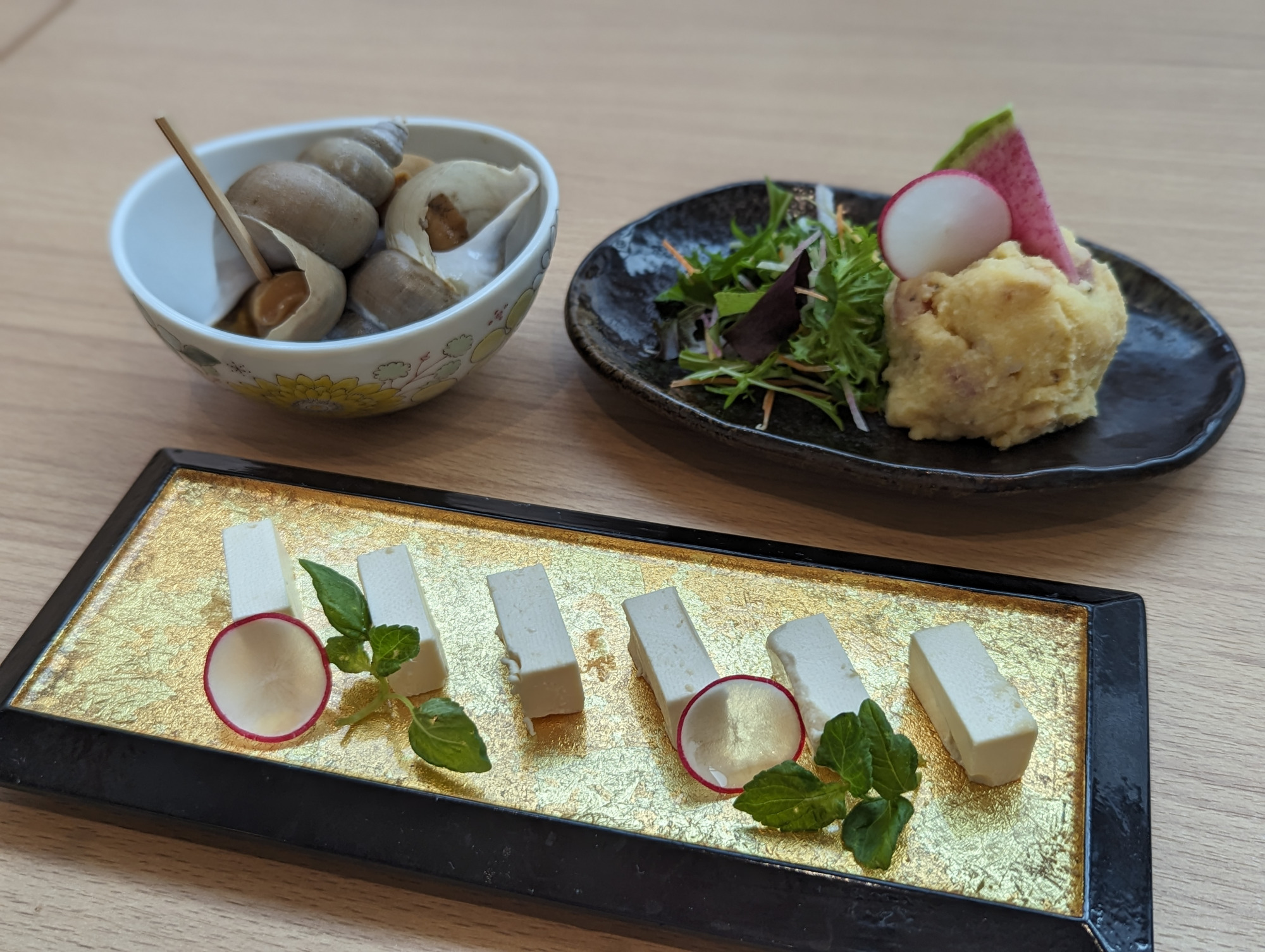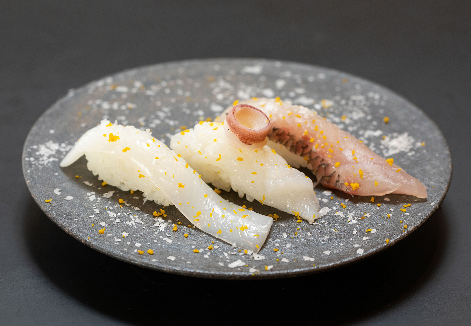 肝のコクと身のコリコリした歯ごたえがたまらないバイ貝、見た目がかわいらしい赤巻、黄身を出汁にといて飲み干す〆の玉子。