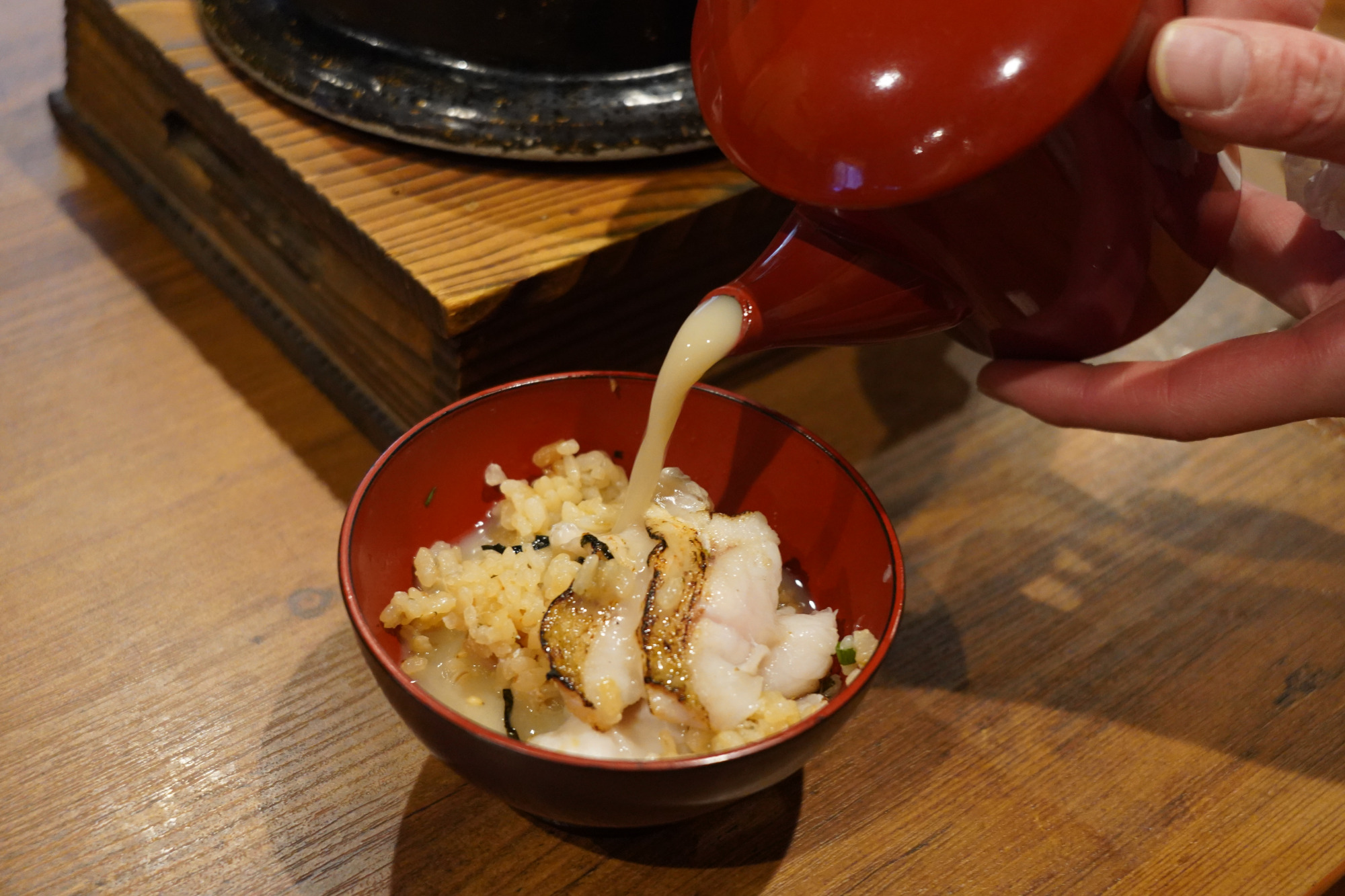 最後はお出汁でいただきます!のど黒の骨と頭を焼いて、昆布出汁で約6時間煮込んだ乳白色の出汁は、のど黒の奥深さをより一層味わえます。