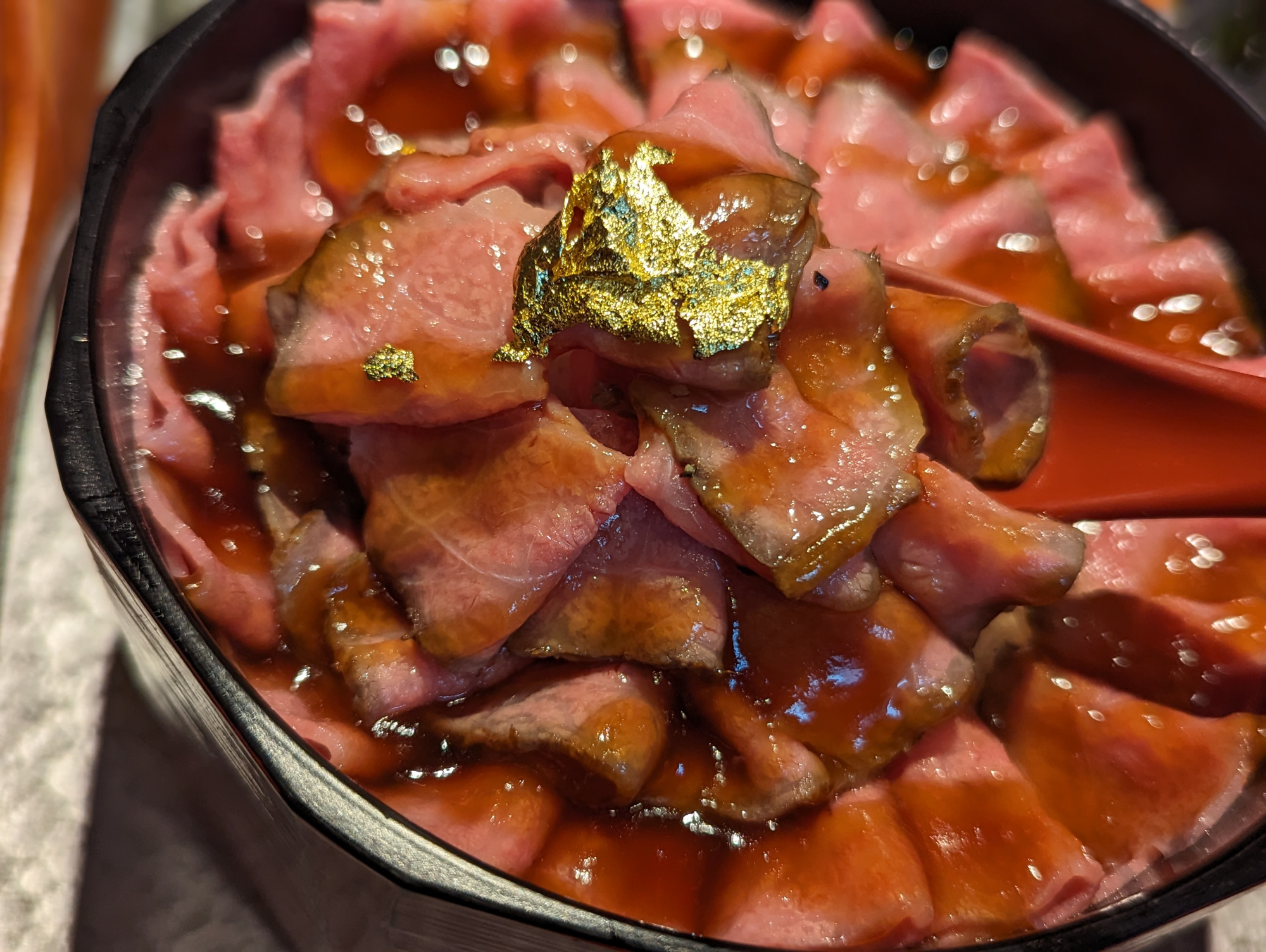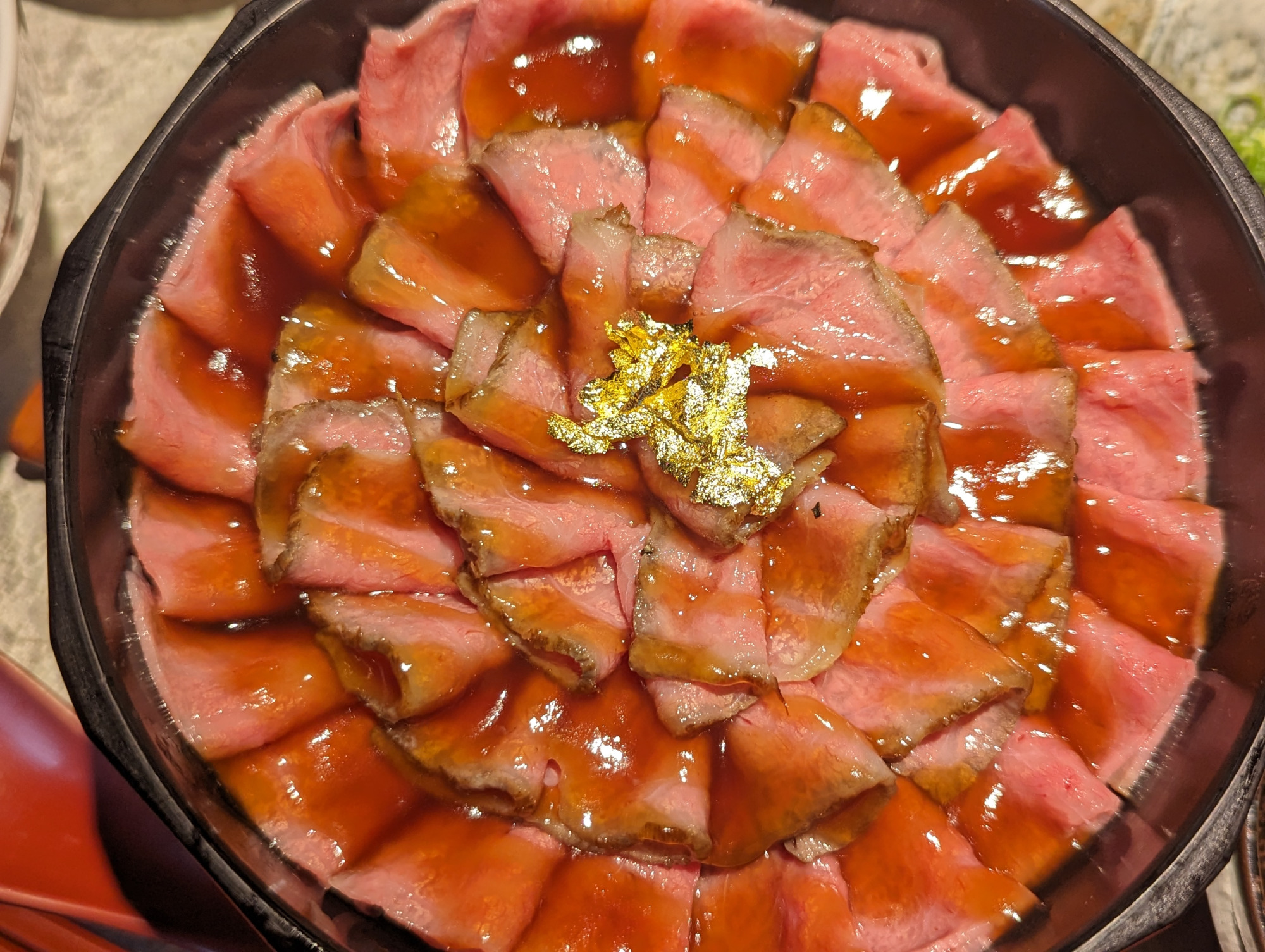 特製のタレと金沢金箔が載せられた「うしまぶし」、うっとりため息…いつまでも眺めていられます。食べるのがもったいない美しさです。