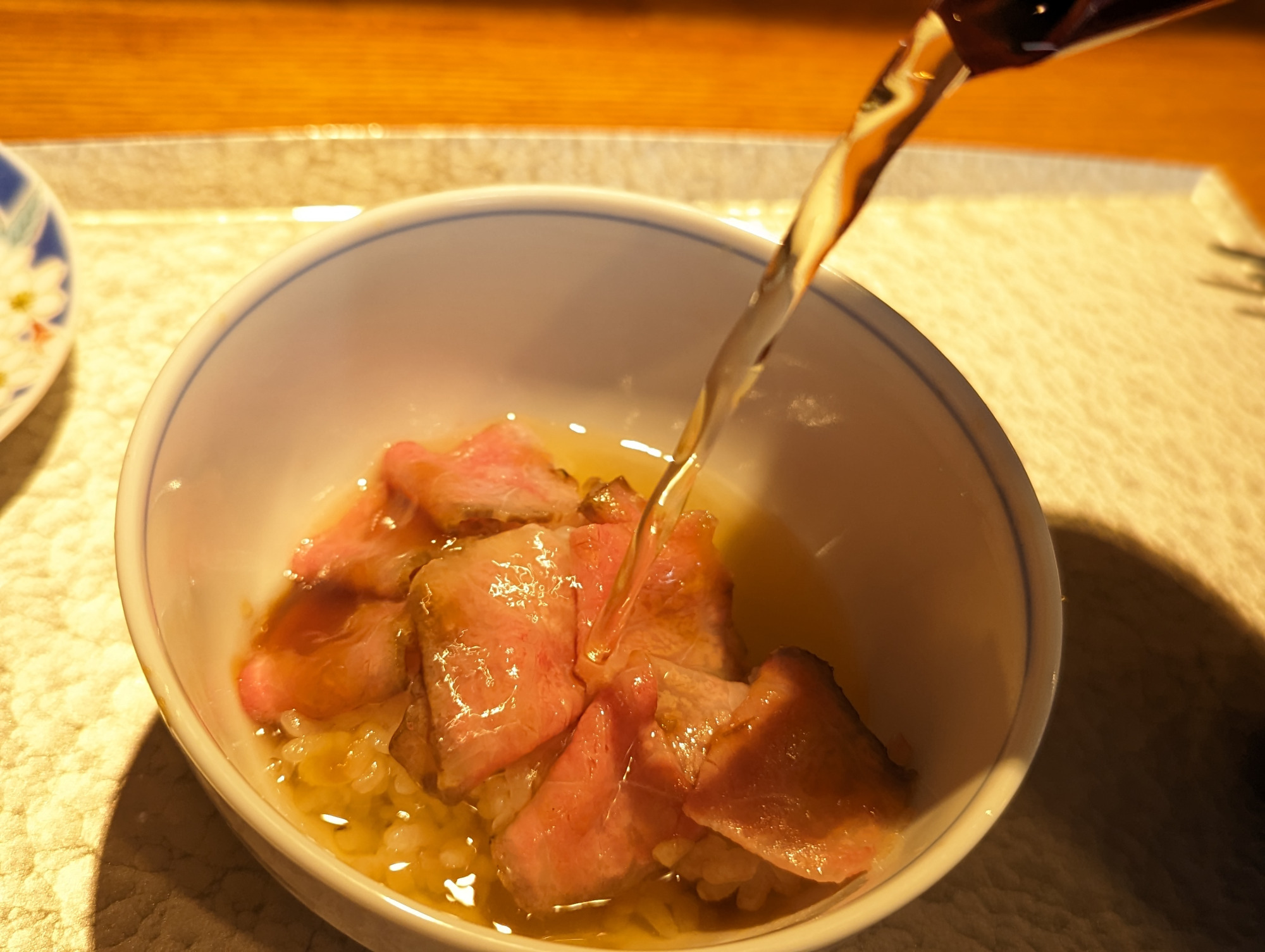 3杯目は毎朝作っているあったかい鰹出汁で出汁茶漬け。あたためると肉もより柔らかくなり更に美味しくいただけますよ。出汁をかけても、なおも輝く能登牛の存在感に感動です。
