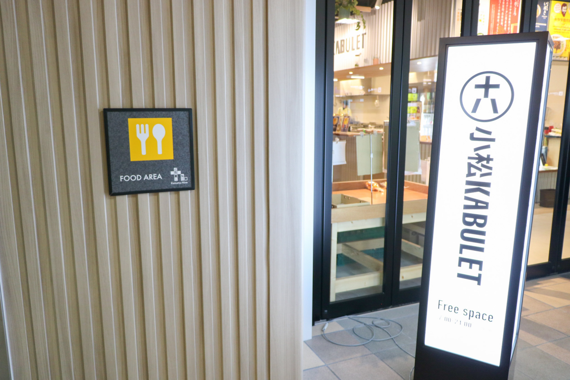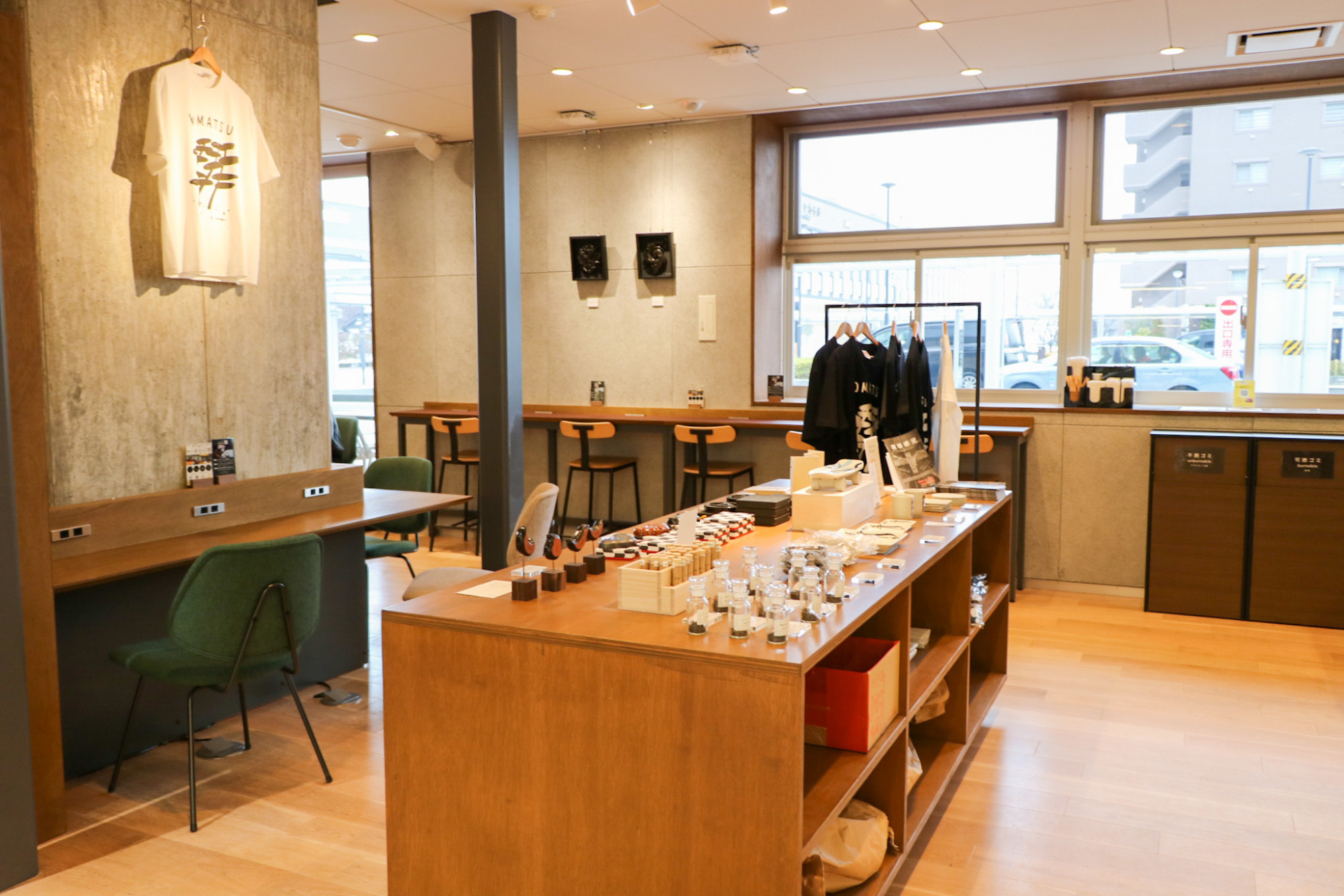 カフェでくつろいだり、小松の特産品や食べ物を選んで過ごせる空間です。