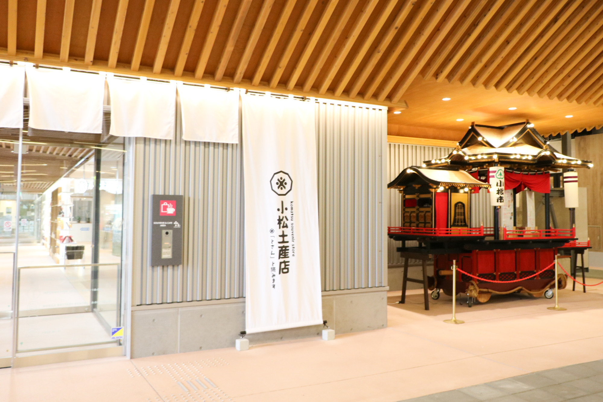 電車の待ち時間の合間に美味しいコーヒーや小松のオリジナルメニューが楽しめるカフェや小松の特産品などお土産が買える『SOUVENIR&CAFE AREA』。